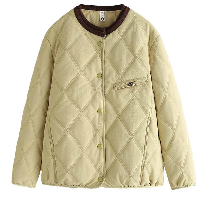 2025冬装韩版新款保暖上衣大码200斤胖mm撞色圆领菱格棉服外套女