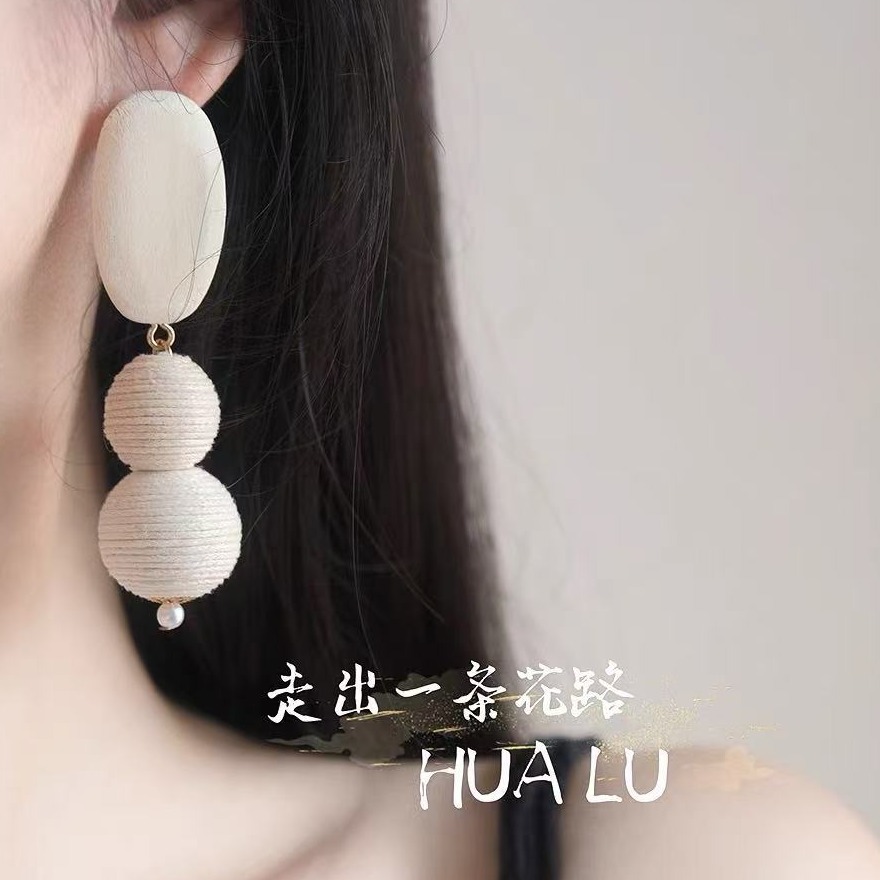 HUALU-沙滩漫步~韩国复古夸张圆形藤编度假风木质耳环气质高级