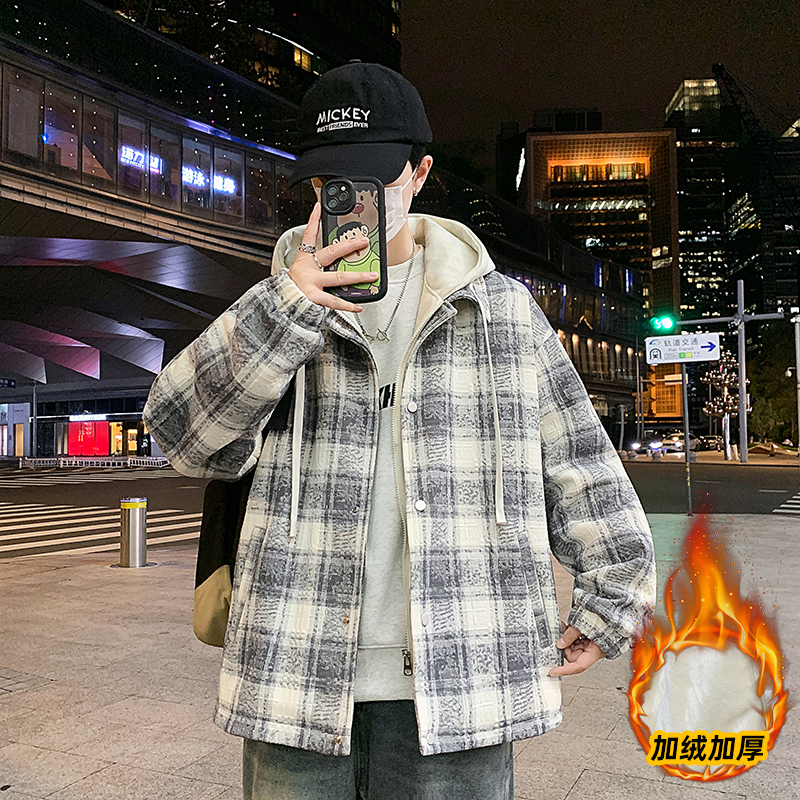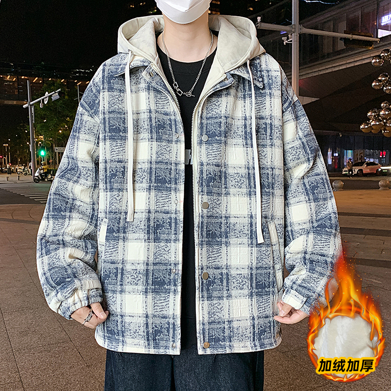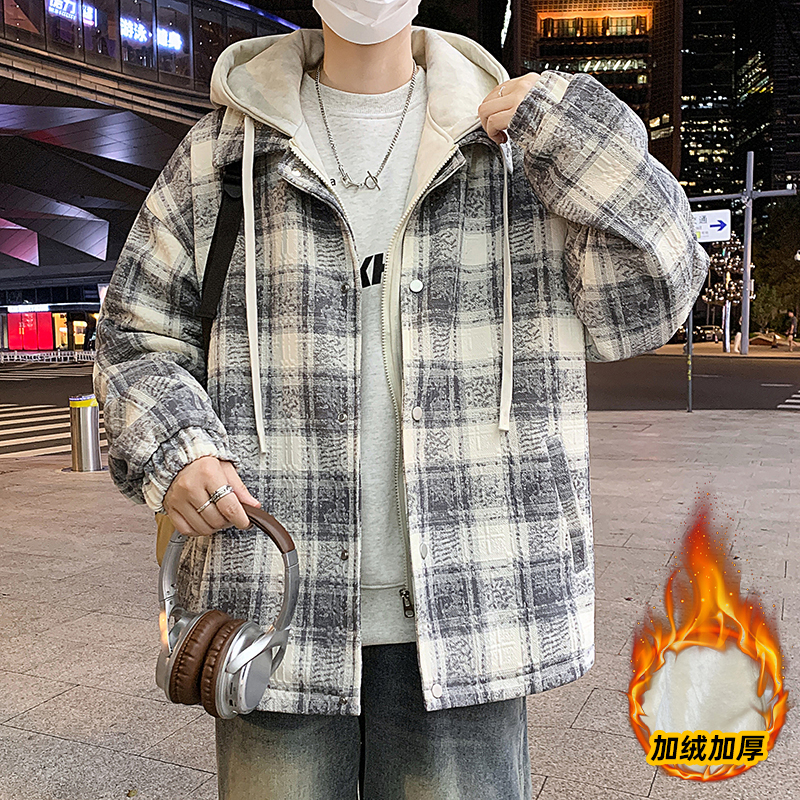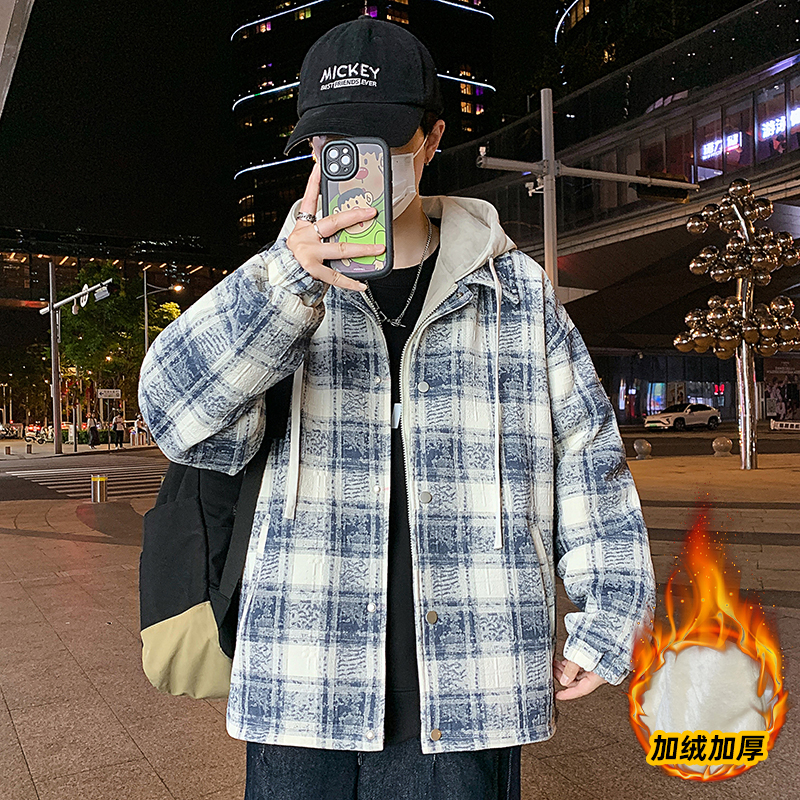 潮牌格子外套冬季假两件连帽夹克男款冬装上衣服加绒加厚棉服以純