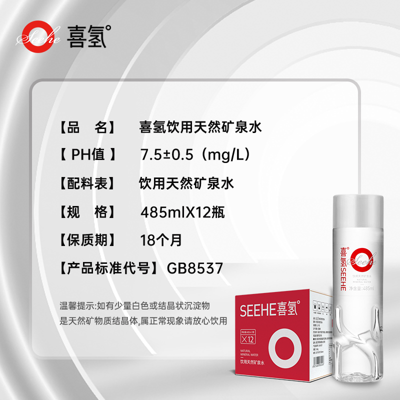 喜氢SEEHE弱碱性天然矿泉水485ml*12瓶 偏硅酸高端整箱饮用水