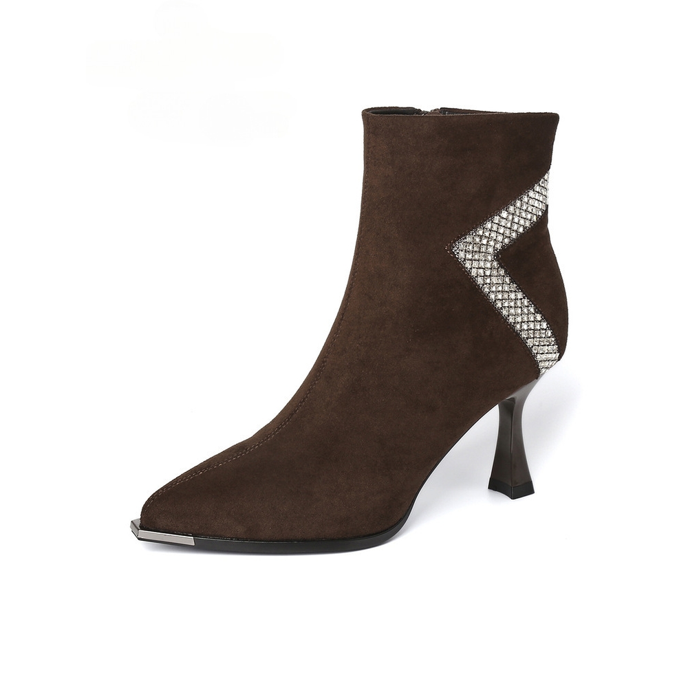 棕色瘦瘦靴女2025新款秋季尖头细跟短靴高跟配裙子妈妈鞋子