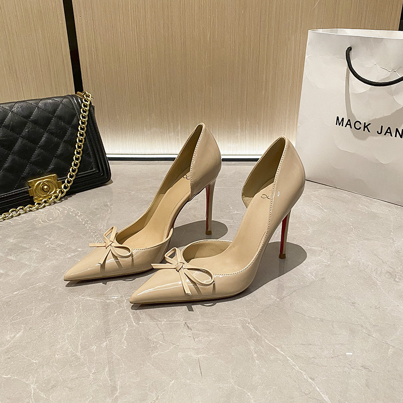 2025侧空新款裸色蝴蝶结法式高跟鞋女气质漆皮尖头细跟夏季单鞋女