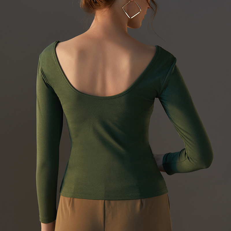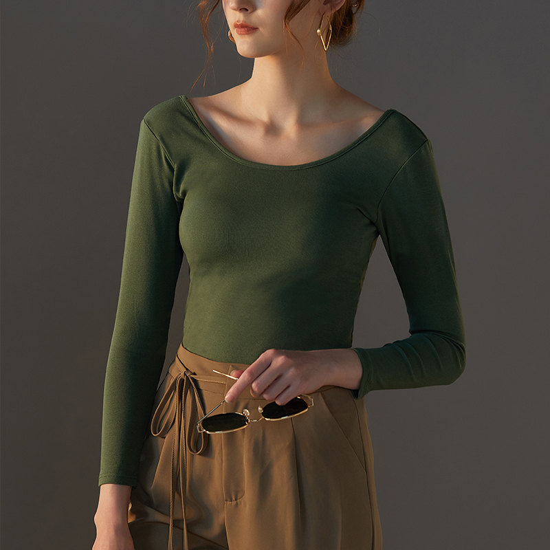 长袖T恤女带胸垫上衣纯棉大U美背打底衫大圆领秋衣免文胸瑜伽服