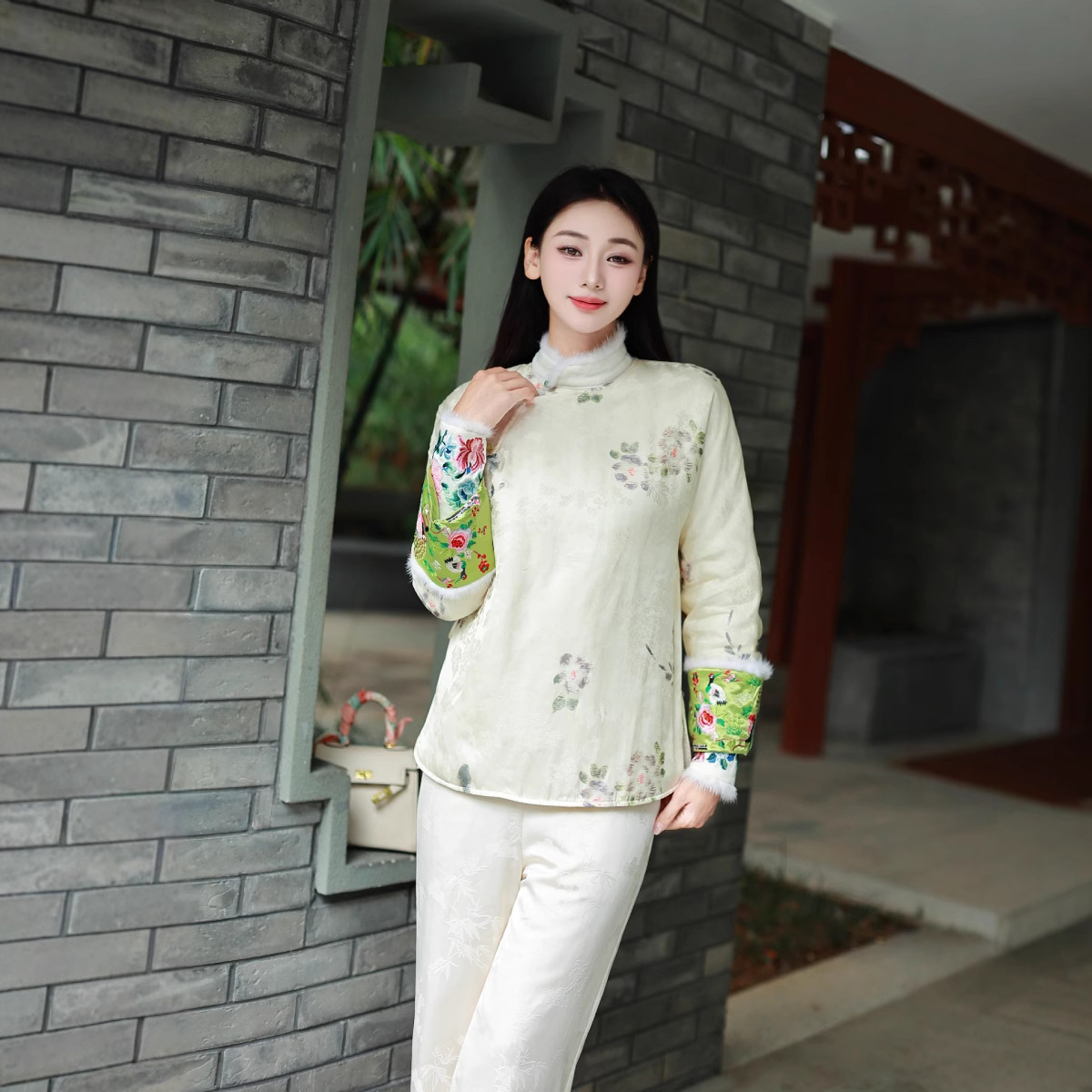 新中式人丝提花拼醋酸刺绣水貂毛夹棉唐装小棉袄国风打底衫上衣女