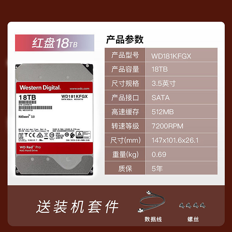 WD/西部数据 WD181KFGX 红盘Pro 网络储存企业级NAS硬盘18TB