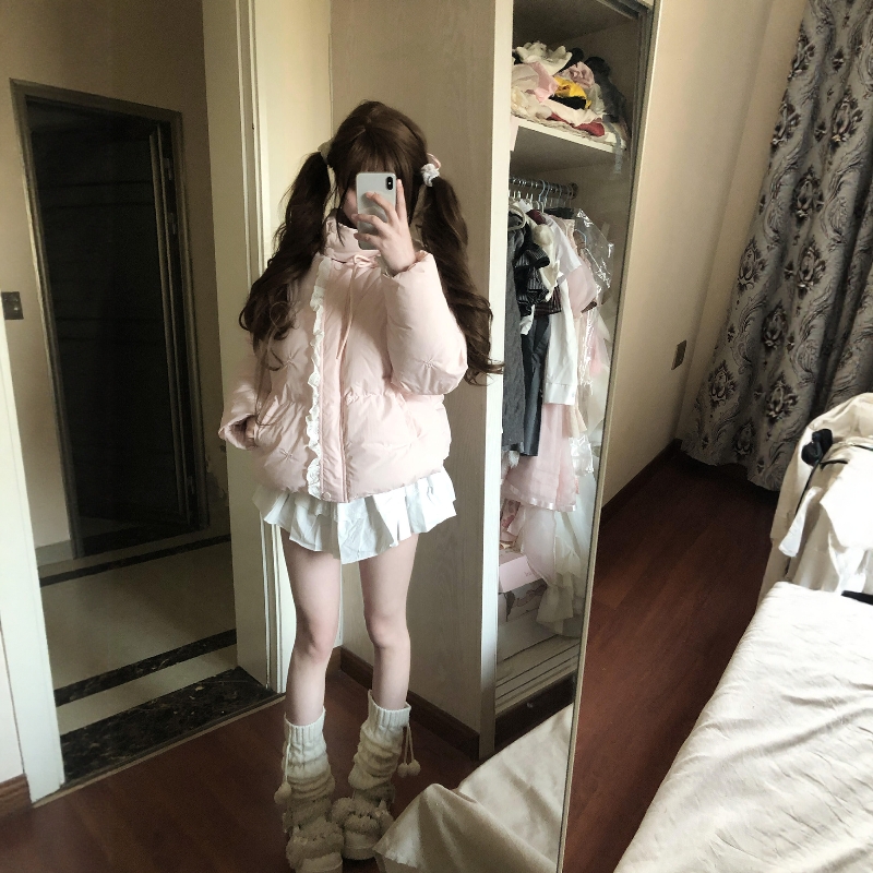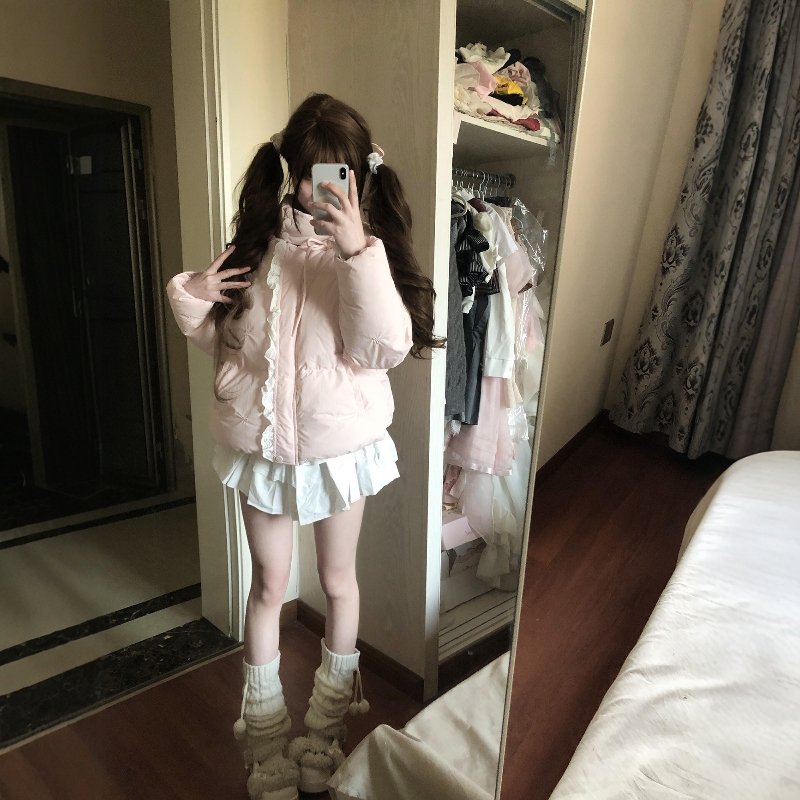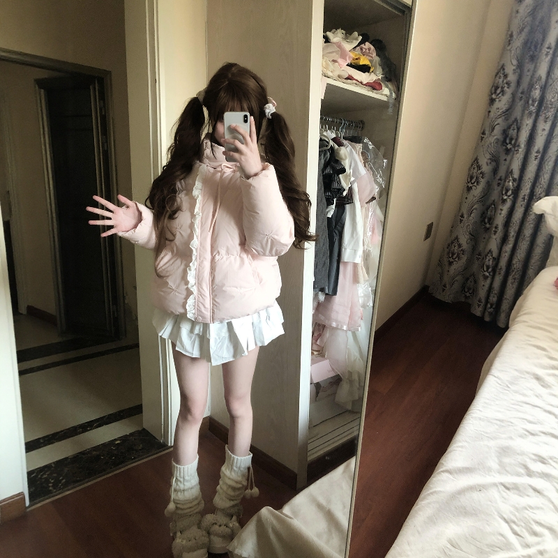 韩系甜美粉色蝴蝶结系带棉服女冬季新款高级感蕾丝拼接面包服外套