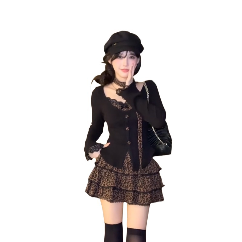 大码胖mm性感纯欲风秋季假两件飘带长袖上衣+豹纹半身裙两件套装