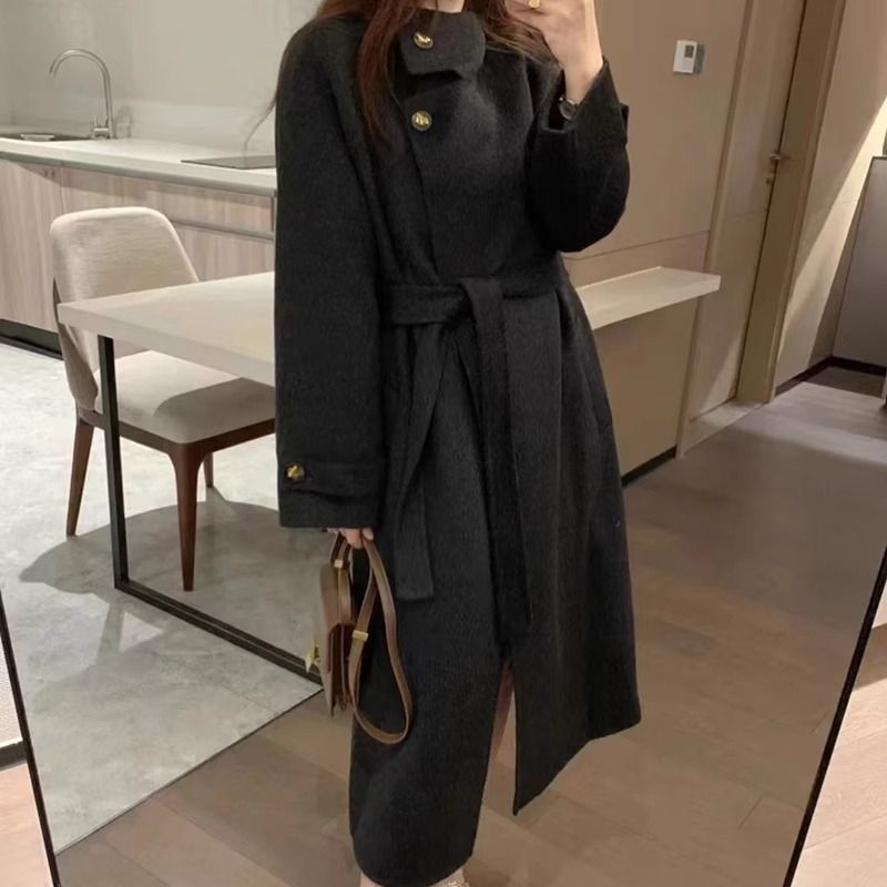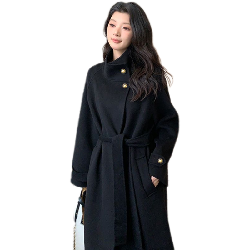 2025秋冬新款韩版立领双面毛呢大衣女中长款系带显瘦双面毛呢外套