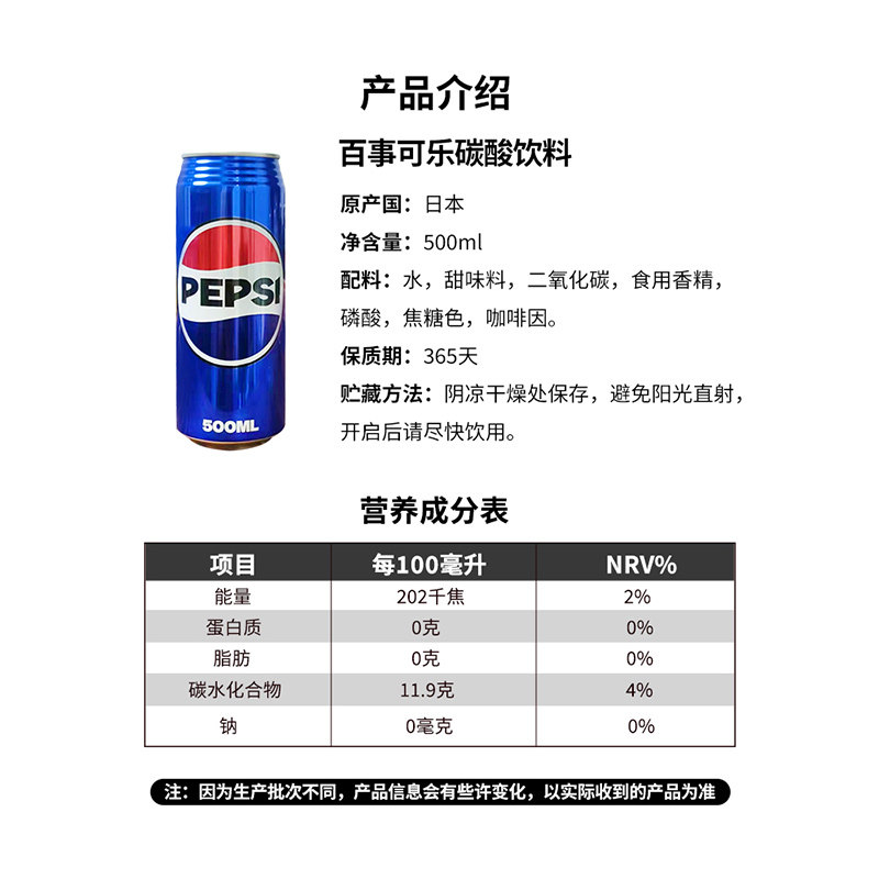 日本进口pepsi百事可乐原味可乐碳酸饮料BIG苏打气泡水500ml*4罐
