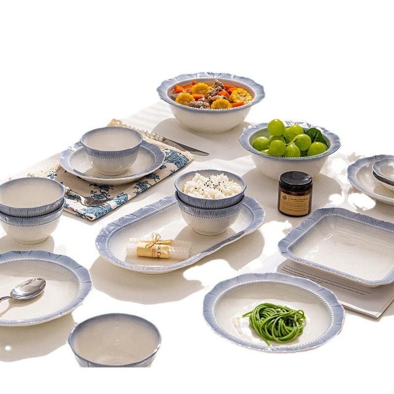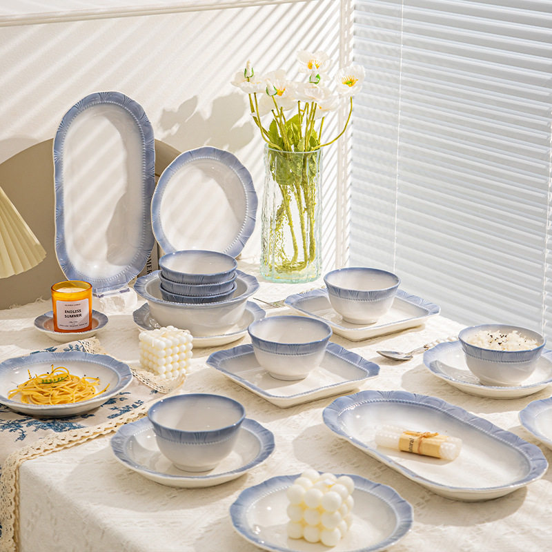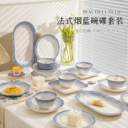 法式烟蓝碗碟套装家用米饭碗乔迁