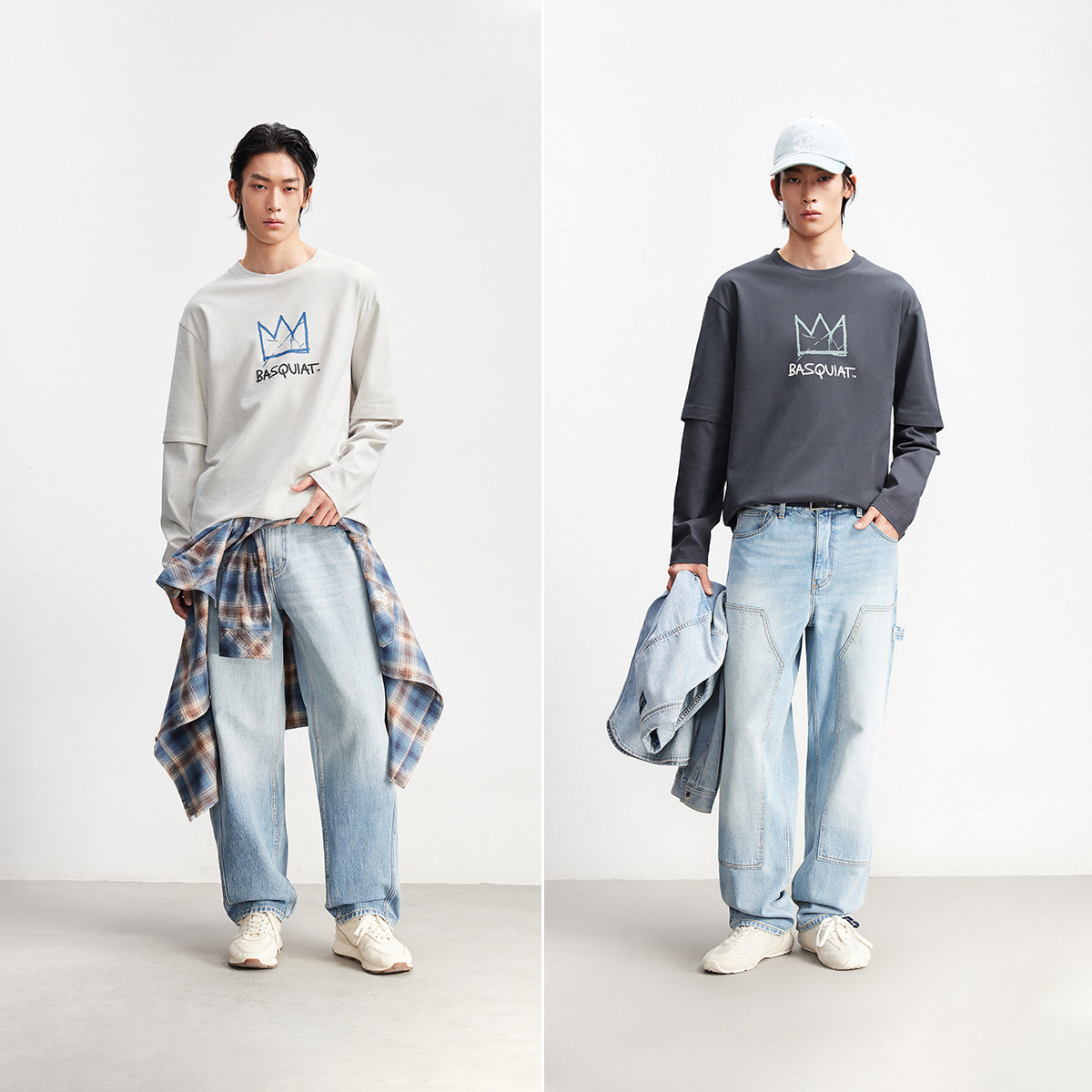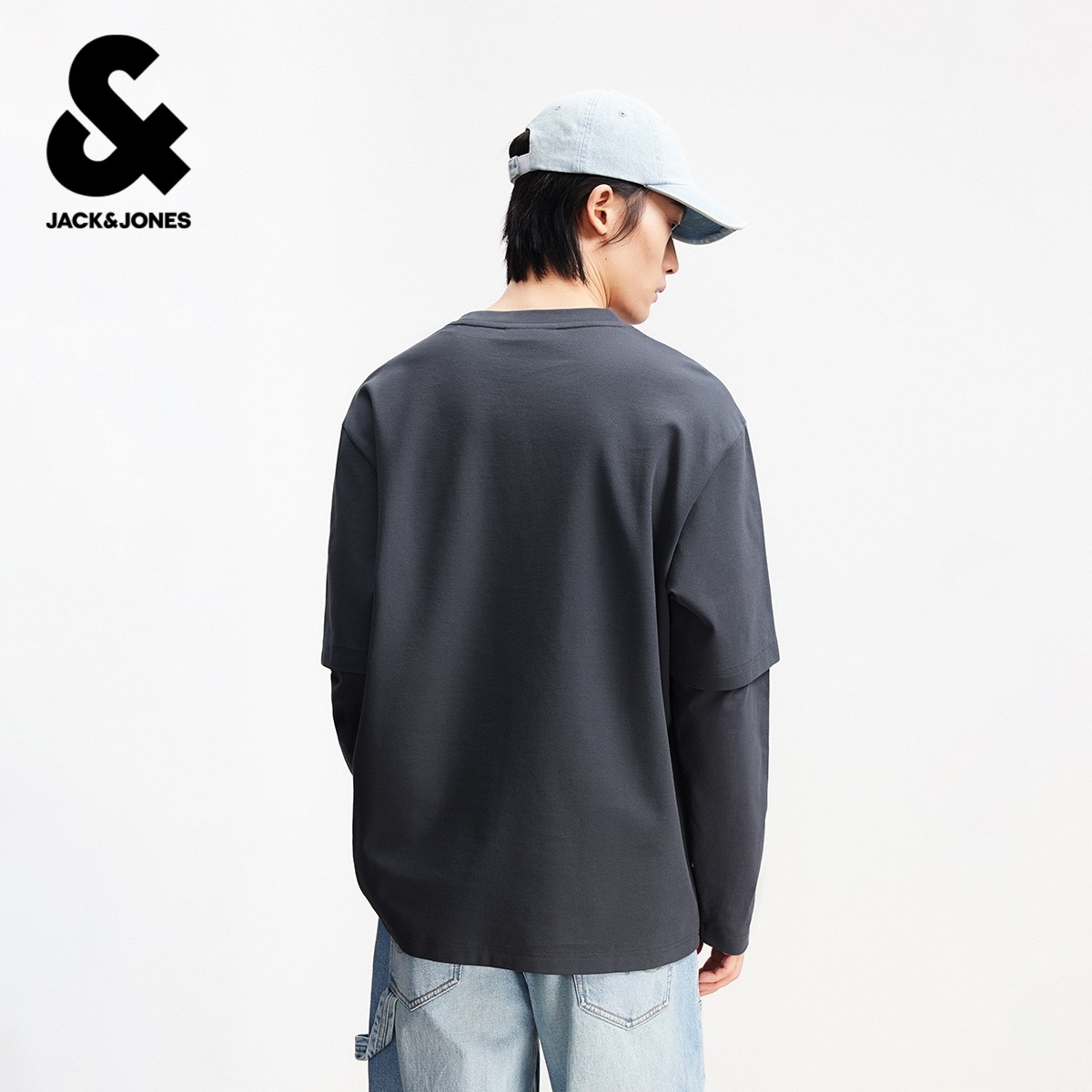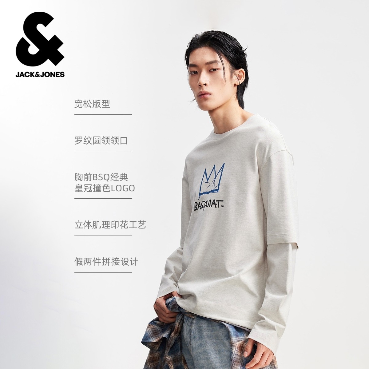 杰克琼斯男装春季T恤宽松休闲潮流立体印花舒适罗纹圆领长袖上衣