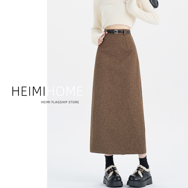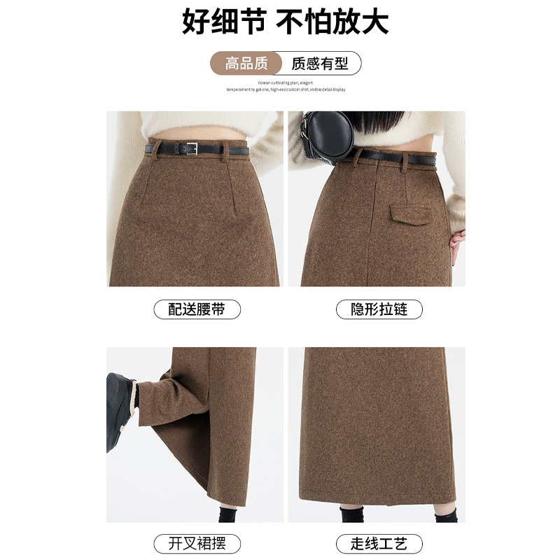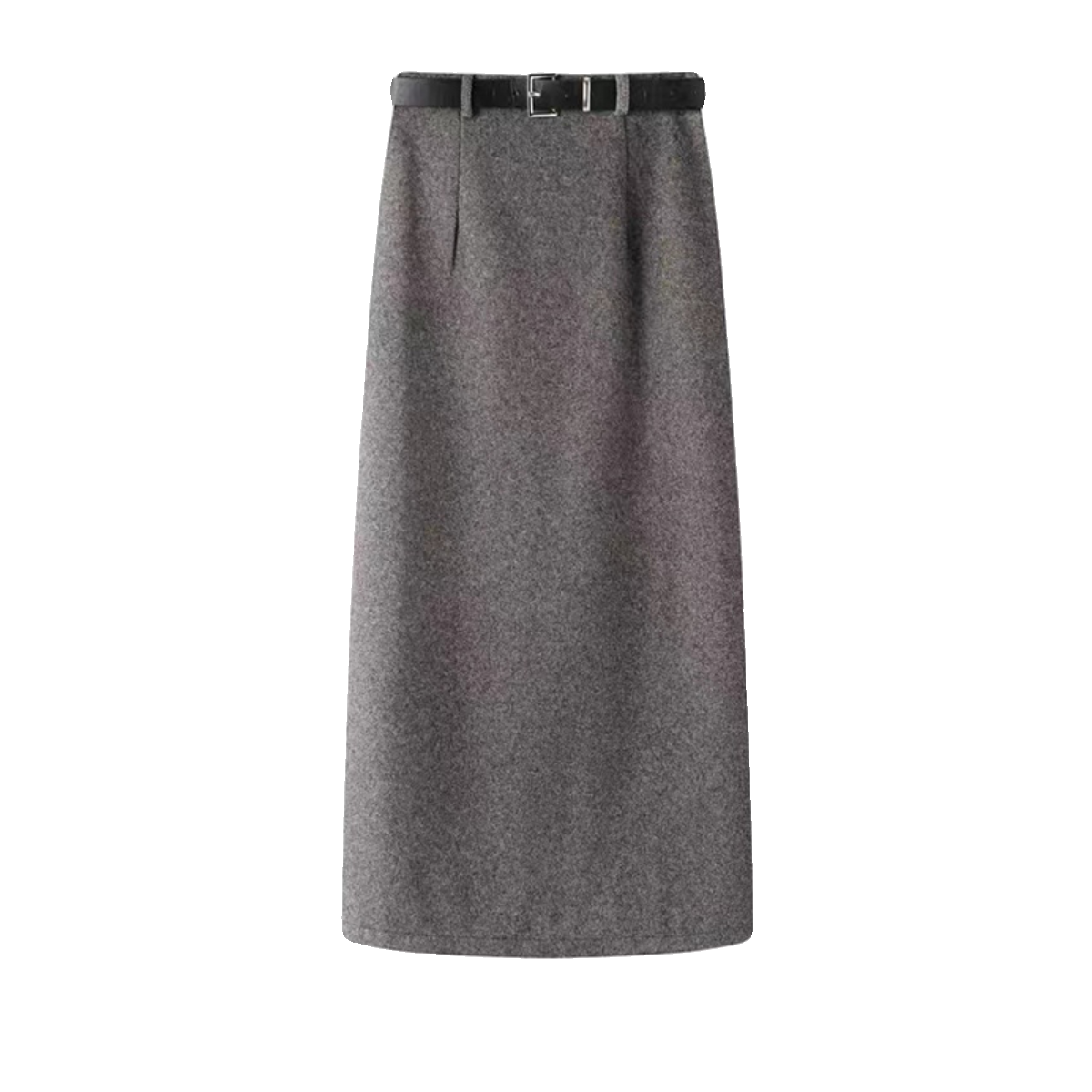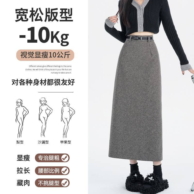 灰色后开叉半身裙女秋冬高腰a字包臀裙遮胯显瘦中长款毛呢长裙潮
