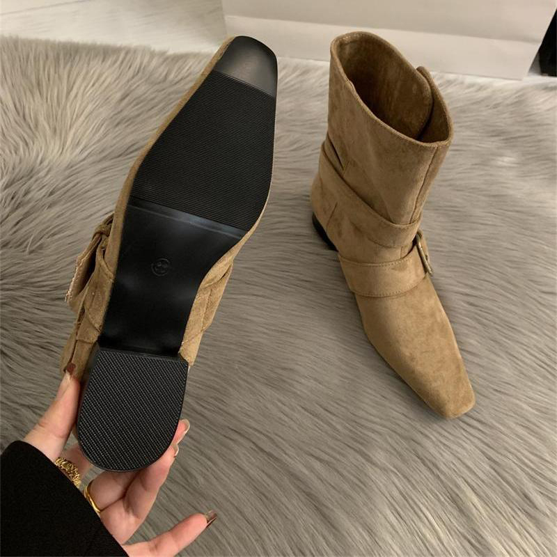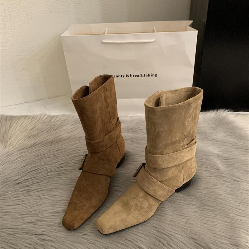 2025韩版新款小众设计复古法式短靴小方头西部靴麂皮中筒靴女靴子