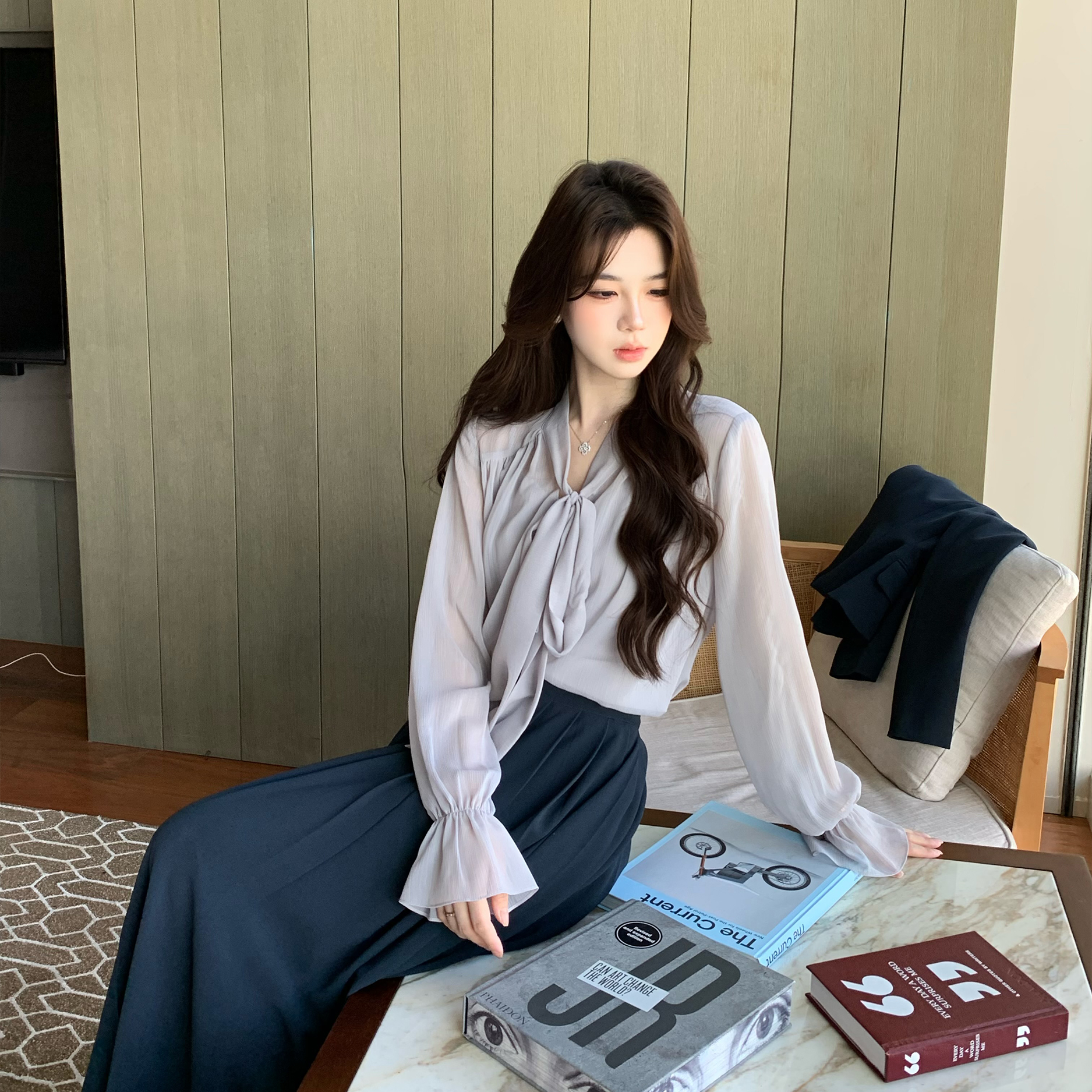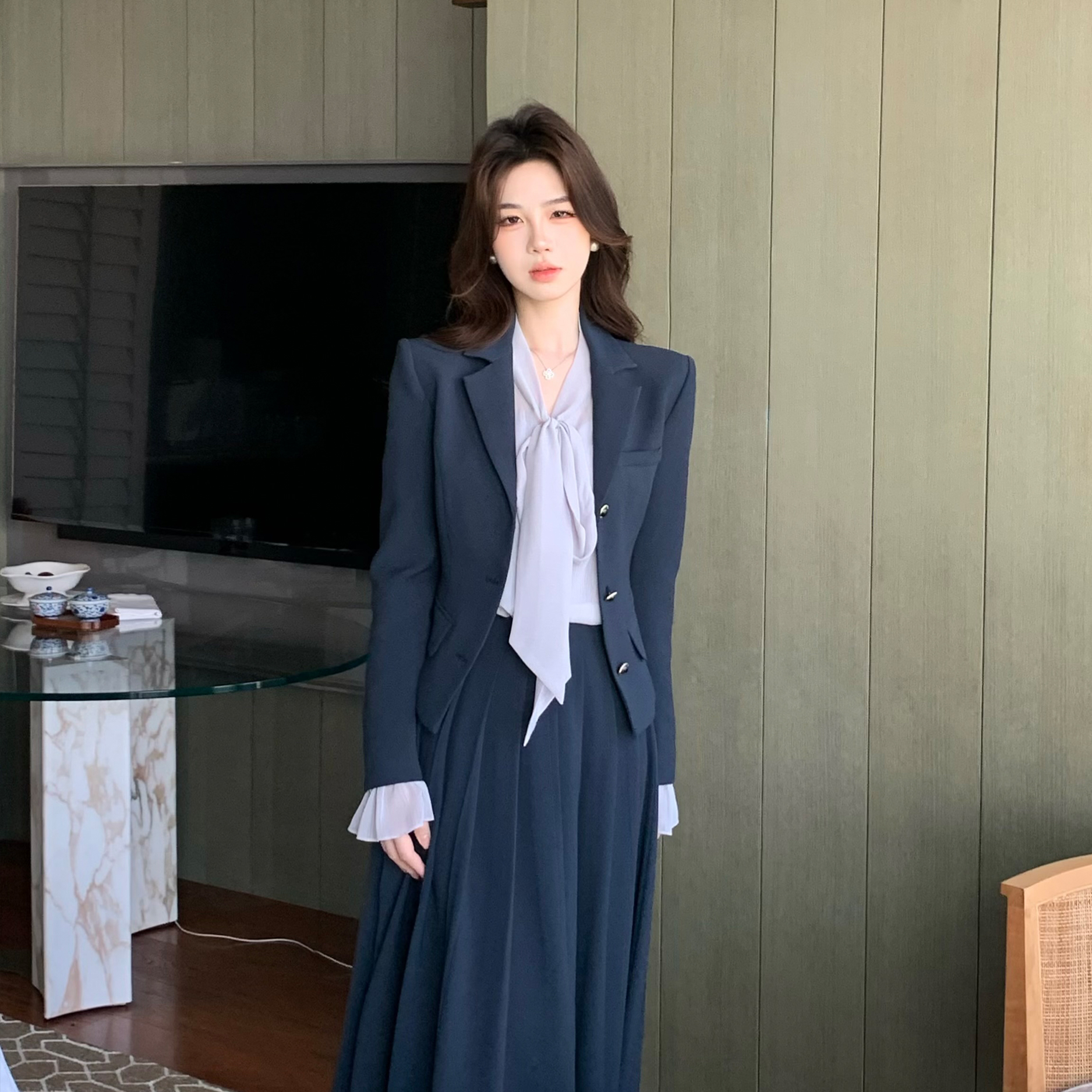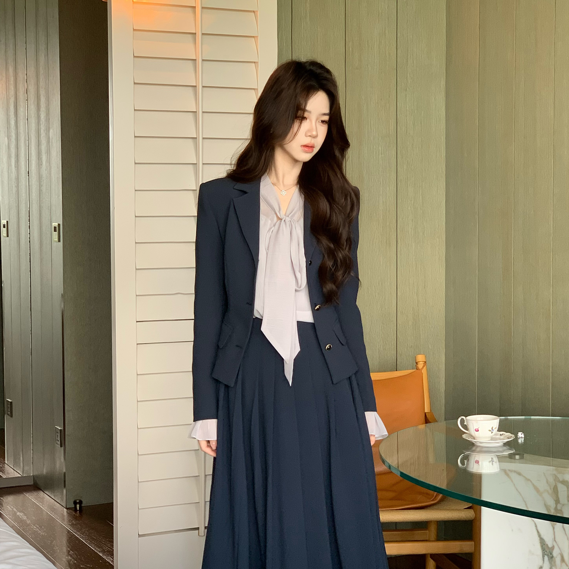 木子李的李优雅长袖垂感宽松衬衫上衣西装外套百褶半身裙套装秋冬