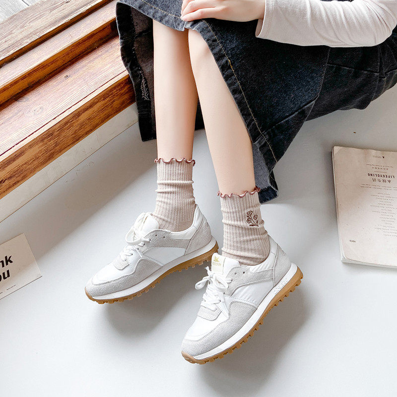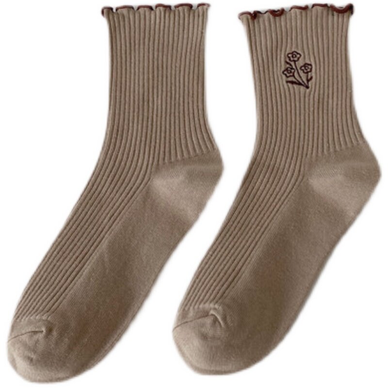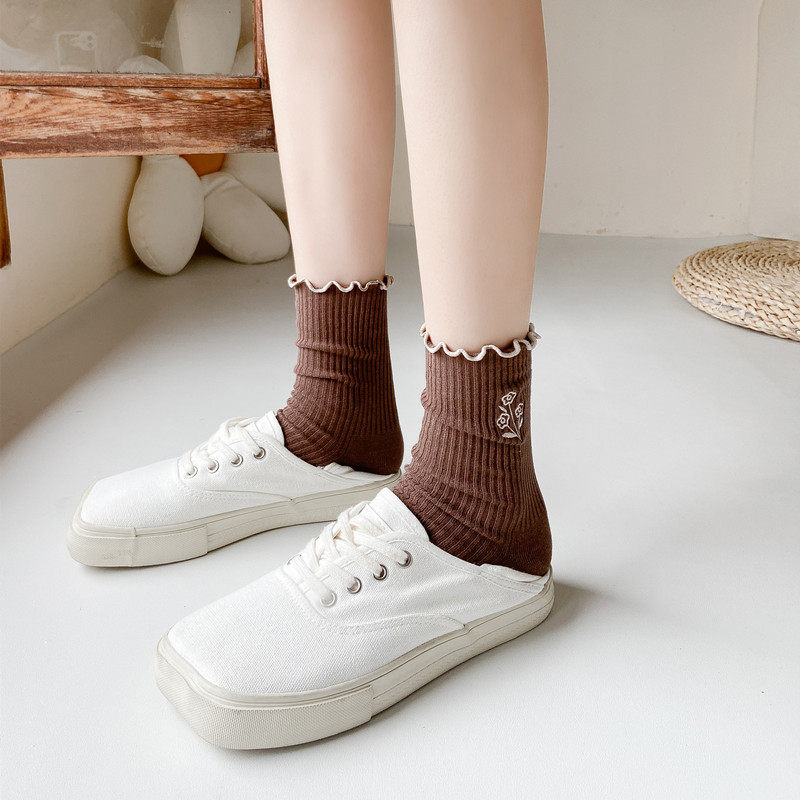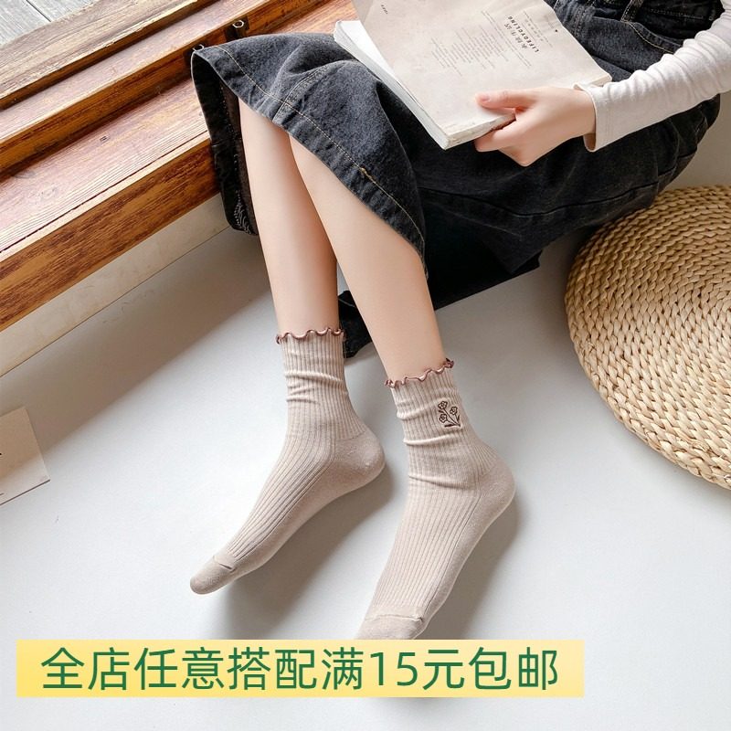 袜子女中筒袜春秋天可爱卡通卷边宽松袜口日系棉袜花朵图案ins潮
