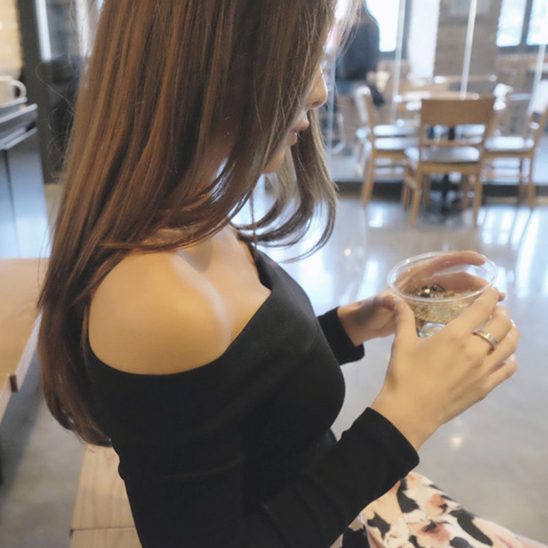 黑色露肩锁骨一字肩上衣女夏季薄款修身打底衫性感紧身长袖t恤秋