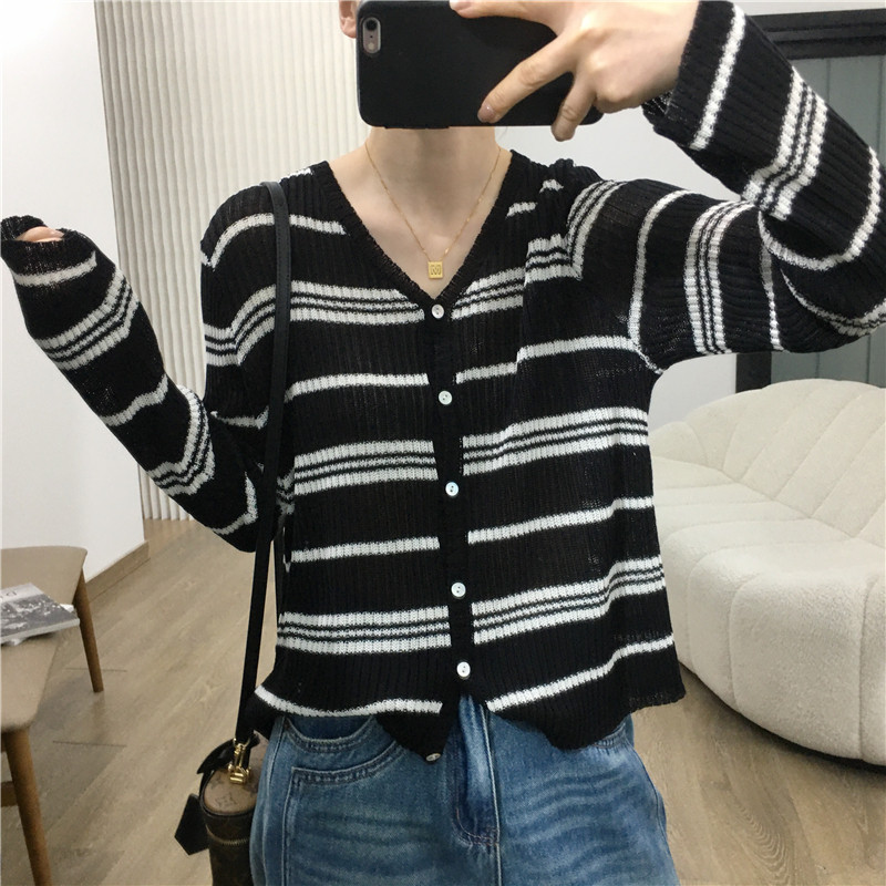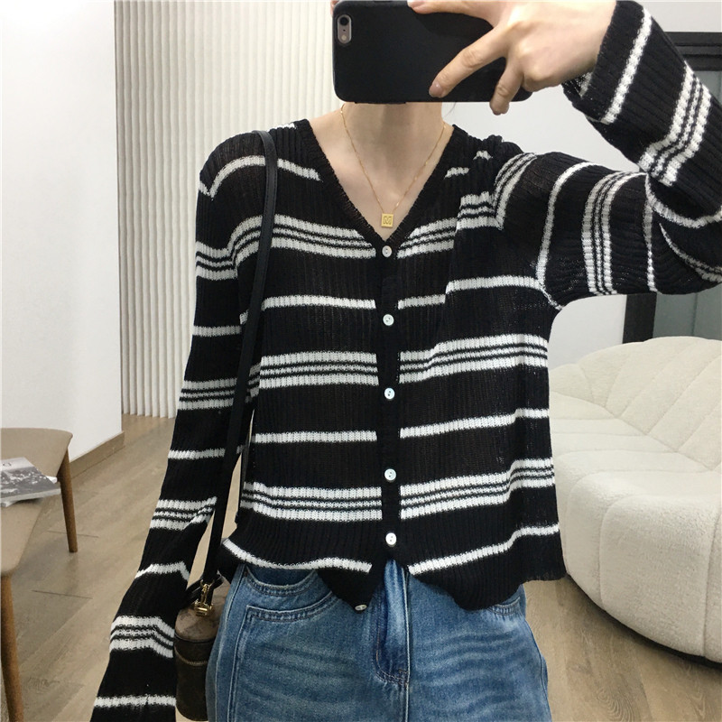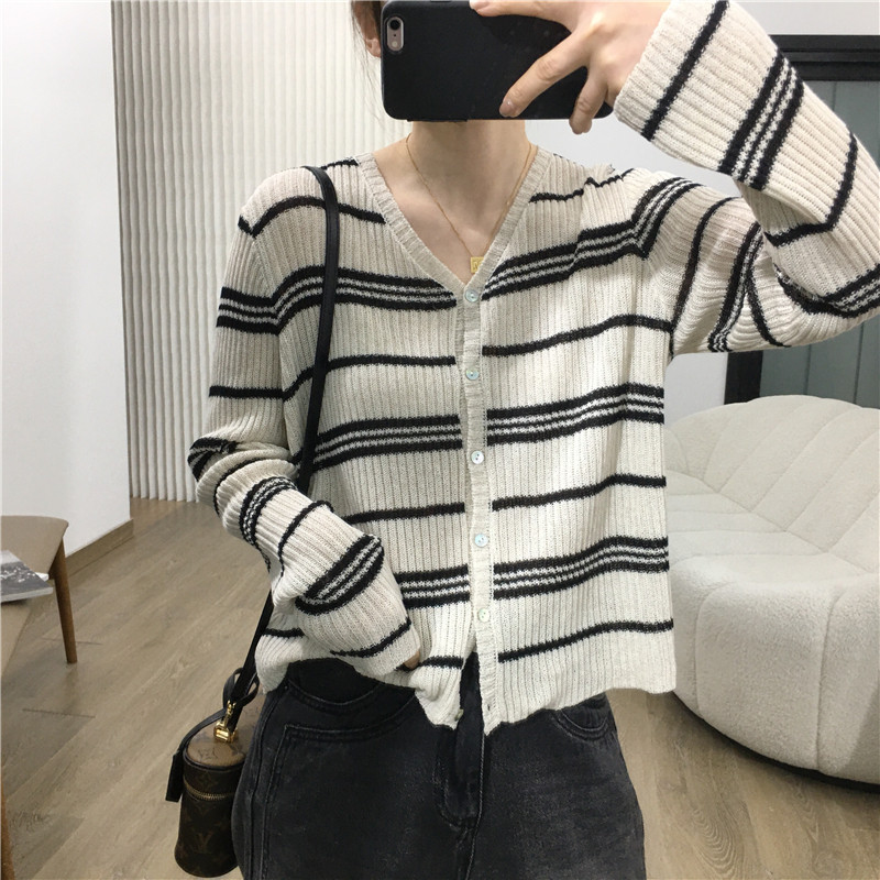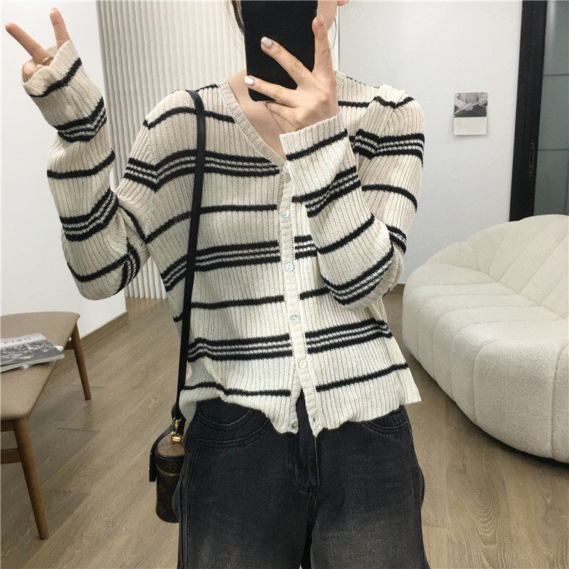 细米定制 天丝亚麻镂空条纹针织开衫女空调防晒衫长袖V领上衣春