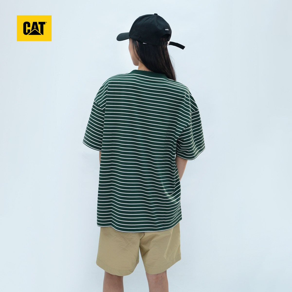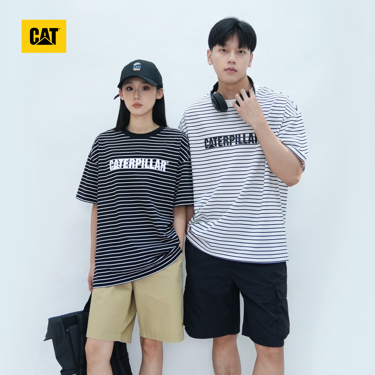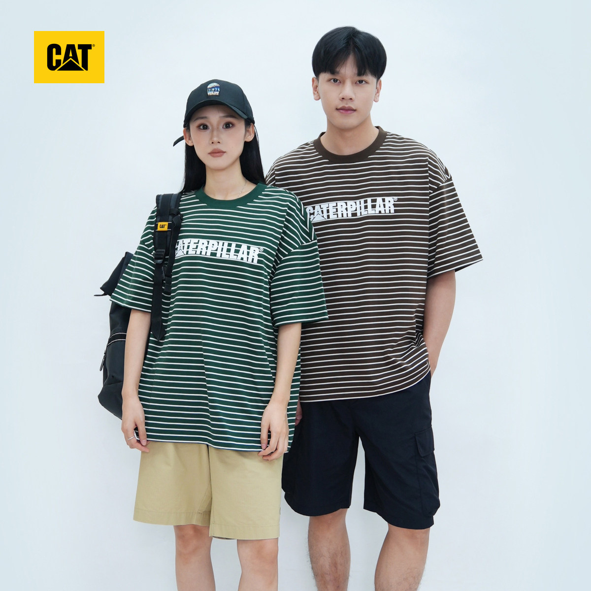 CAT卡特夏季男女同款户外休闲百搭横条纹Logo印花情侣短袖T恤