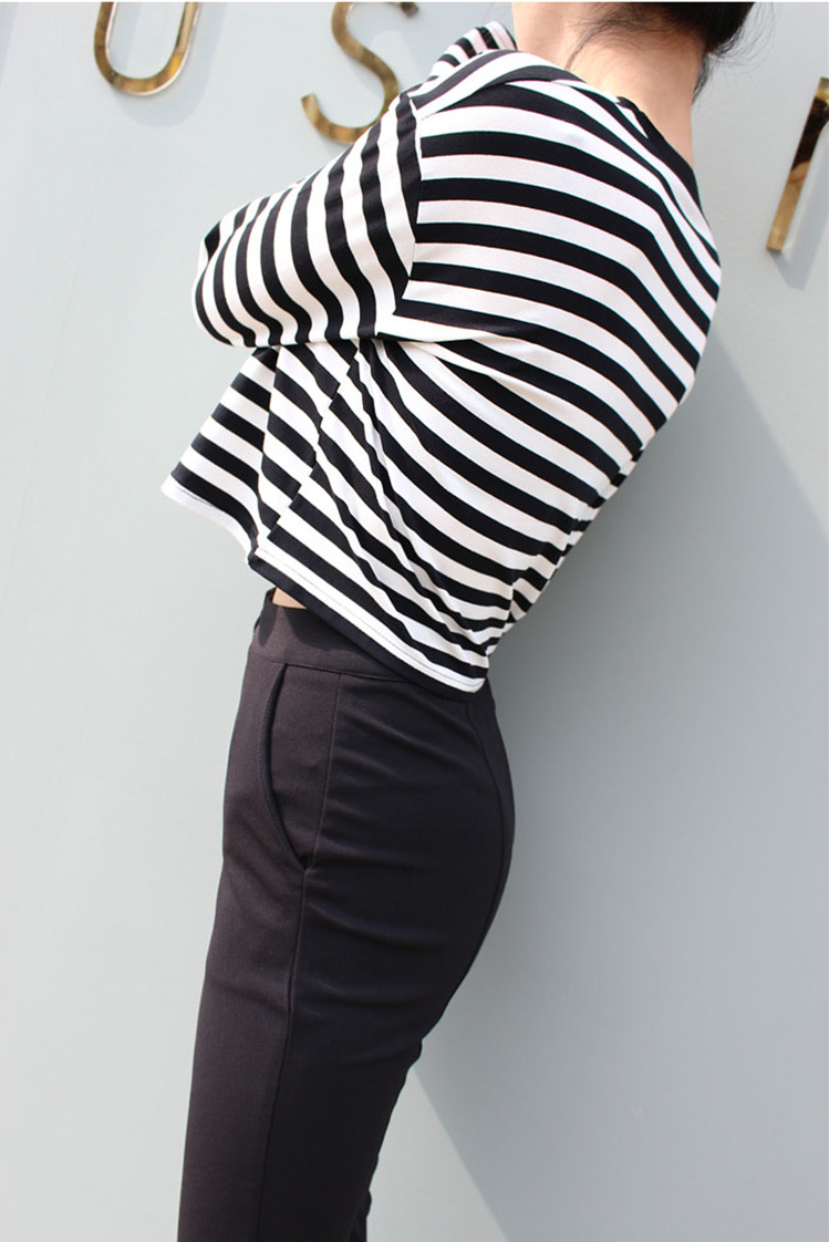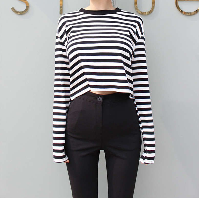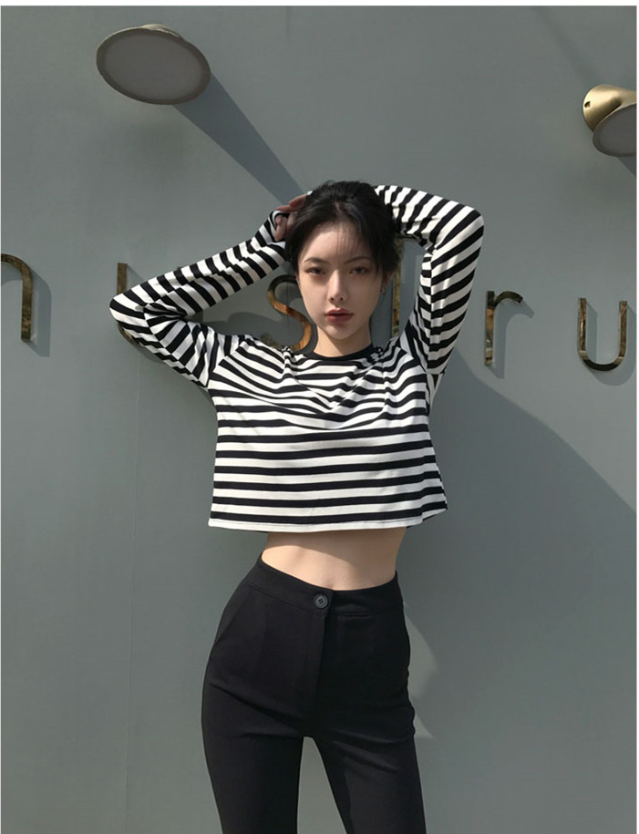 露脐学生条纹体恤高腰漏肚脐短款BF风宽松长袖t恤春秋打底衫女