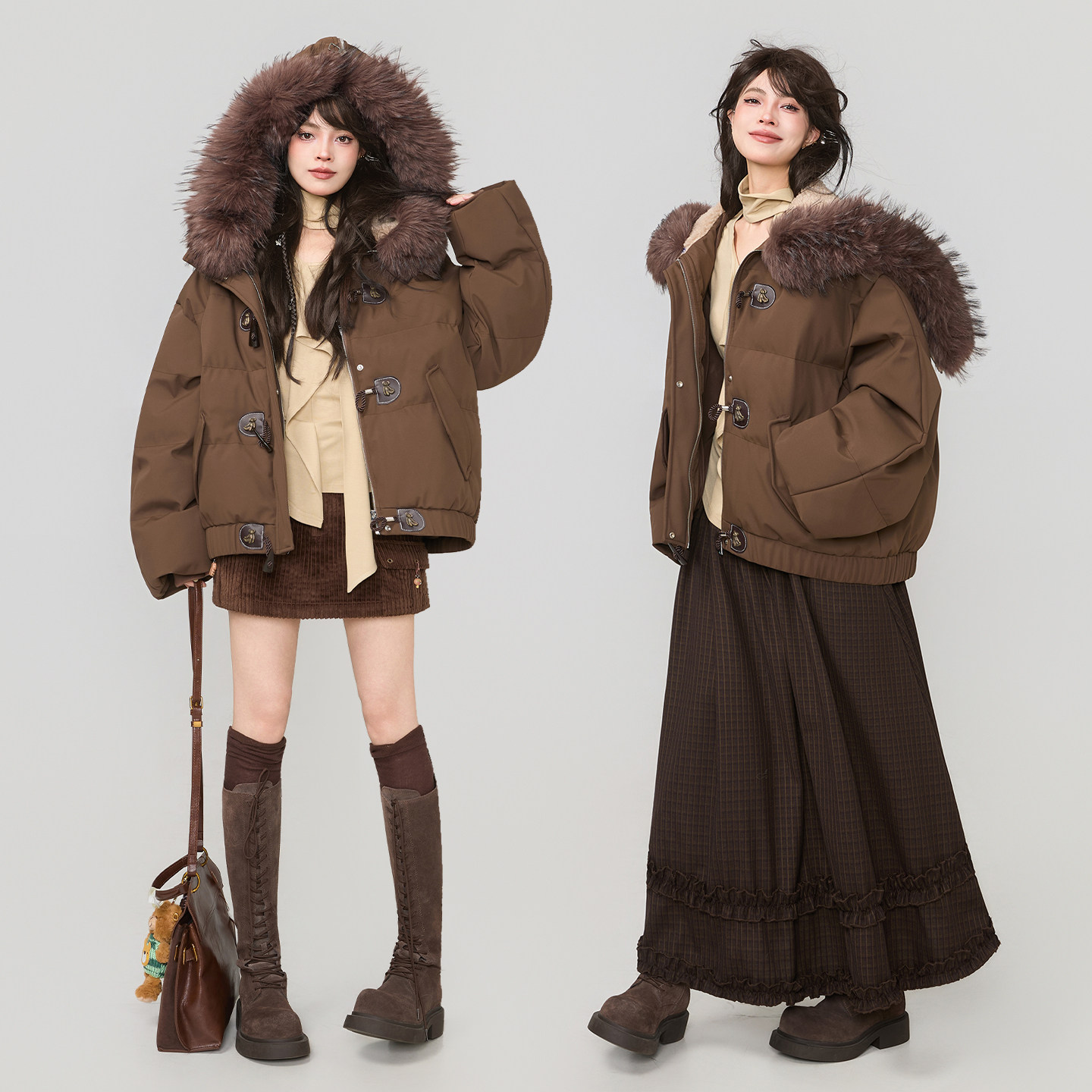 KEIKO可卸大毛领短款牛角扣棉服