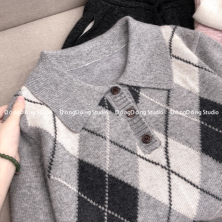 厚墩墩![英伦格]复古菱格提花方领套头宽松长袖针织POLO衫 9013
