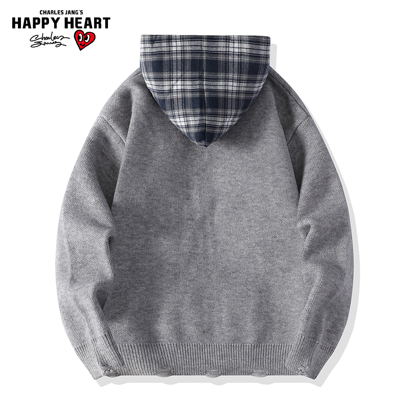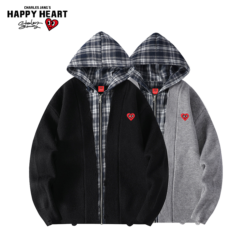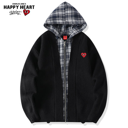 查尔斯桃心 格子连帽针织开衫男女春秋季假两件宽松情侣百搭外套
