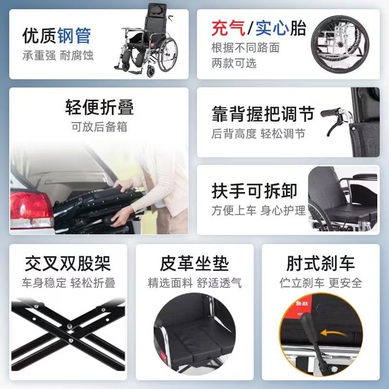 鱼跃手动轮椅车h008b全躺轮椅瘫痪老人专用折叠轻便代步车带坐便