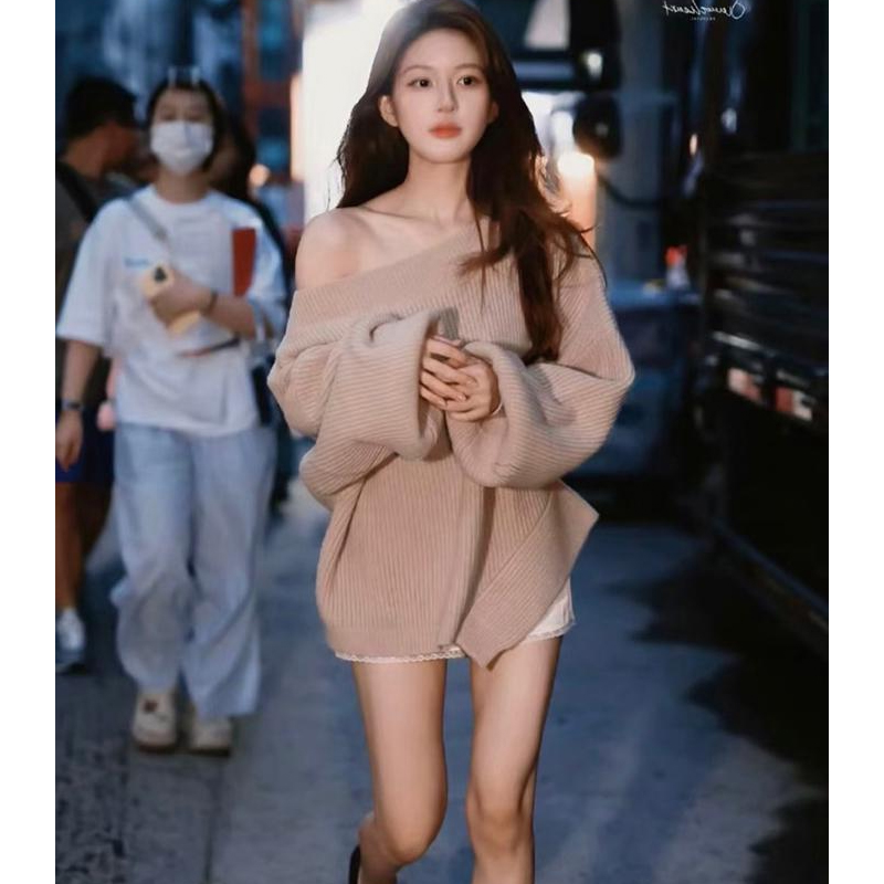 赵露思同款软糯慵懒风毛衣女秋冬季宽松显瘦中长款针织衫斜领上衣