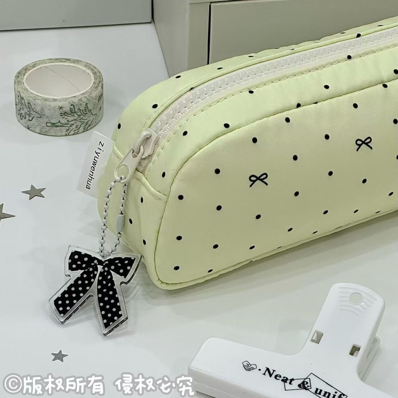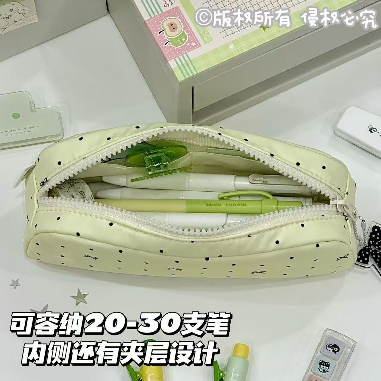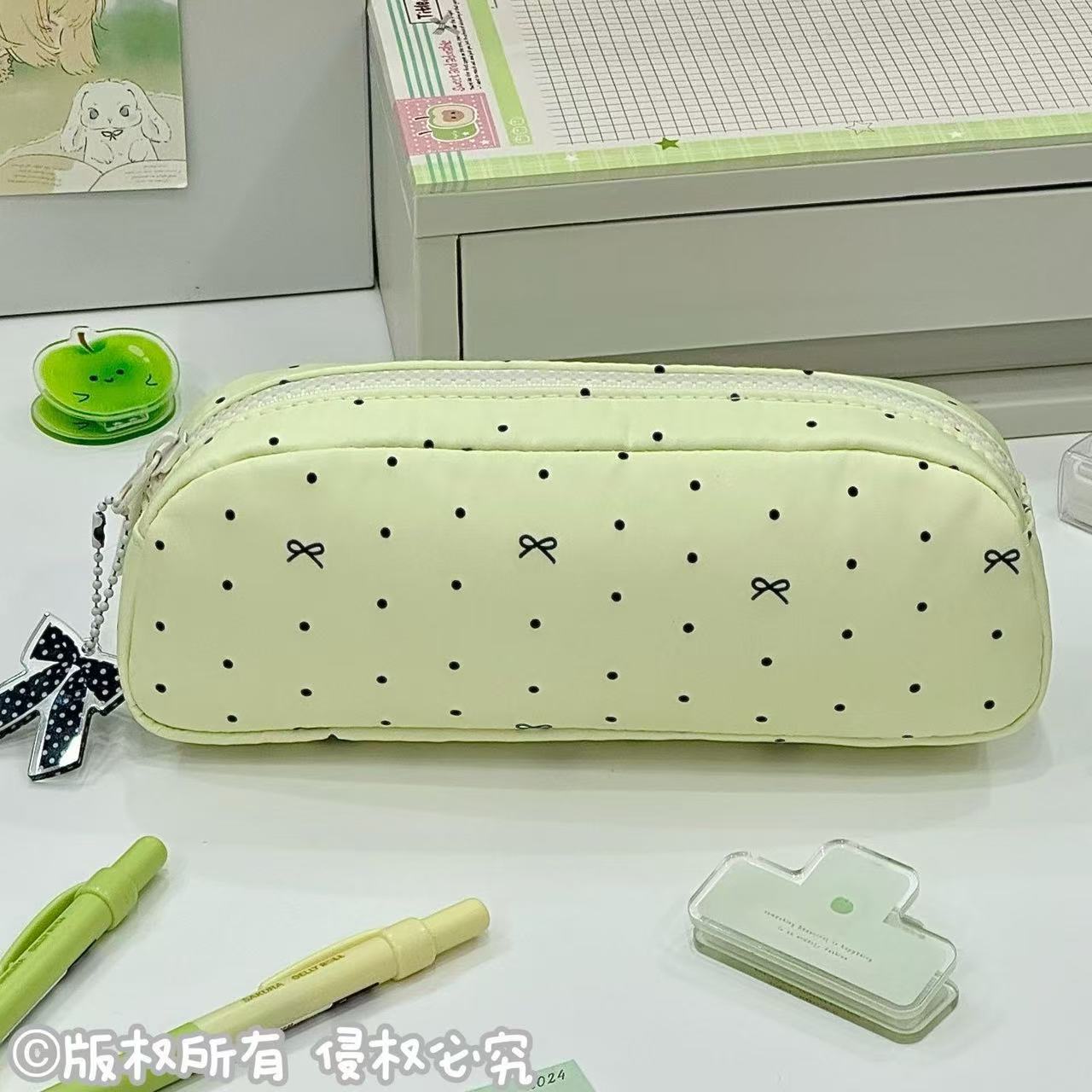 2025新款韩系绿色波点蝴蝶结面包笔袋简约高颜值大容量文具收纳袋
