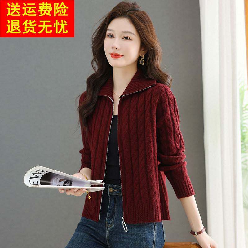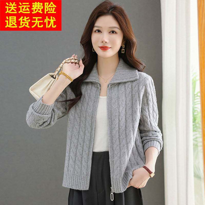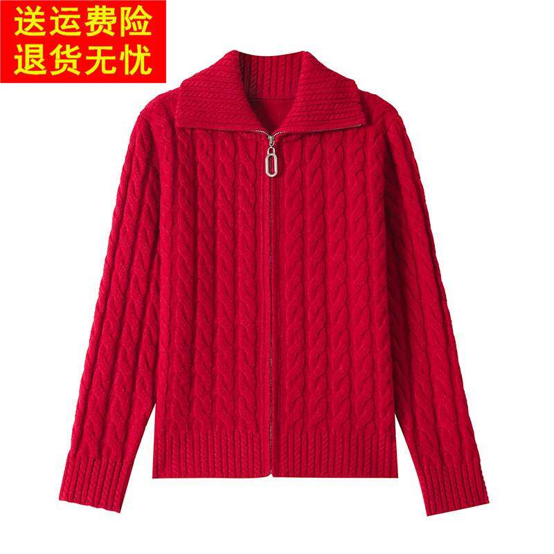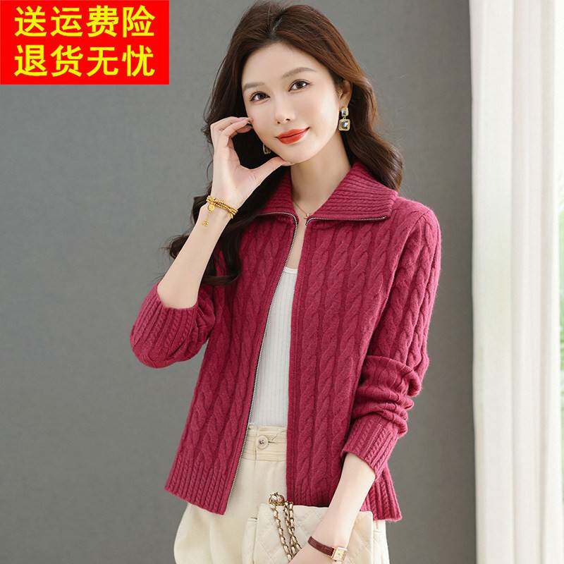 鄂尔多斯市麻花羊毛毛衣针织开衫女休闲上衣秋冬新款翻领拉链外套