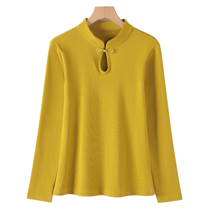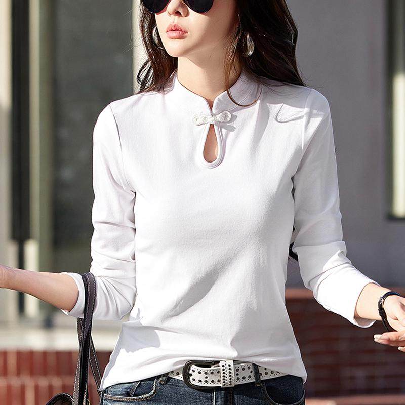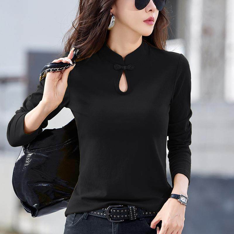 新中式纯棉立领盘扣上衣女国风改良长袖打底衫秋冬修身黑色t恤女