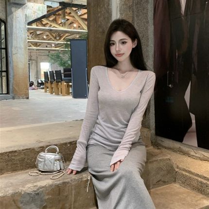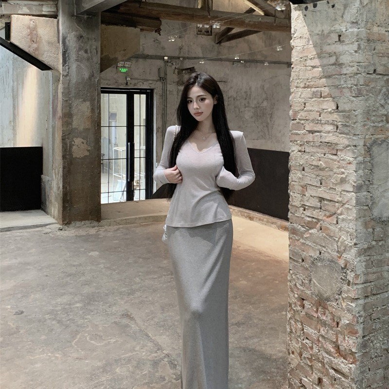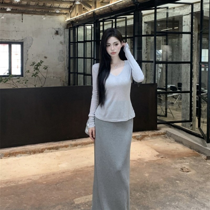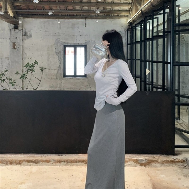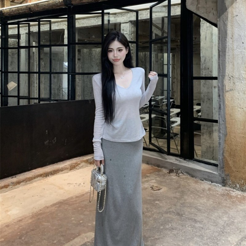 纯欲v领灰色长袖针织t恤女初秋z宽松薄款K天丝打底防晒空调罩衫上