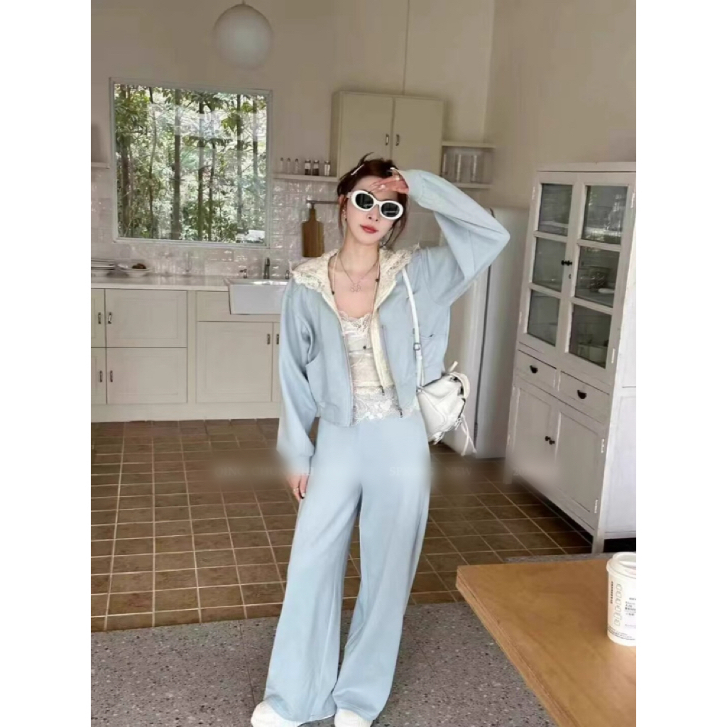 春秋穿搭套装慵懒风假两件蕾丝拼接连帽卫衣阔腿裤运动休闲两件套