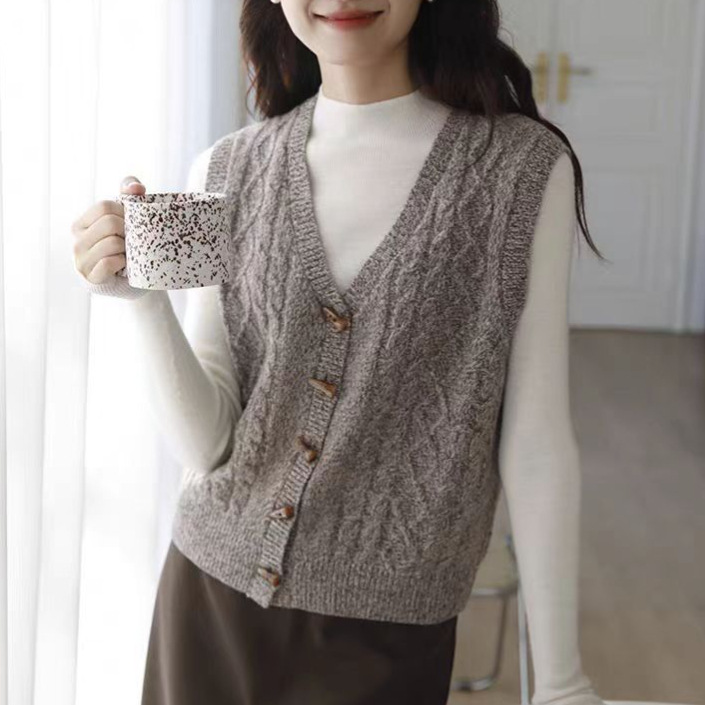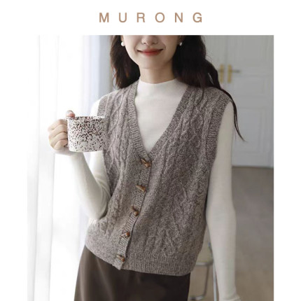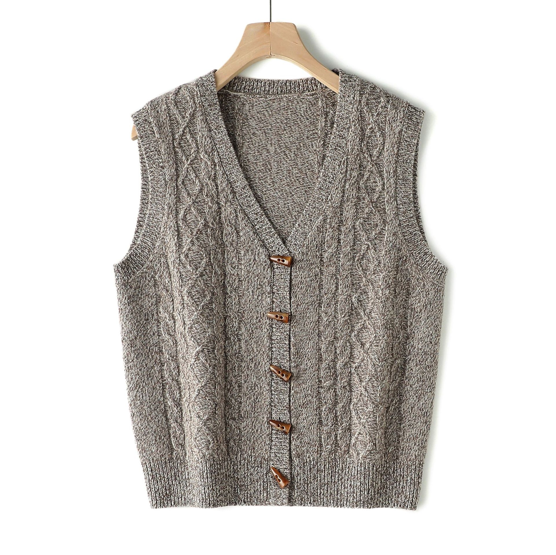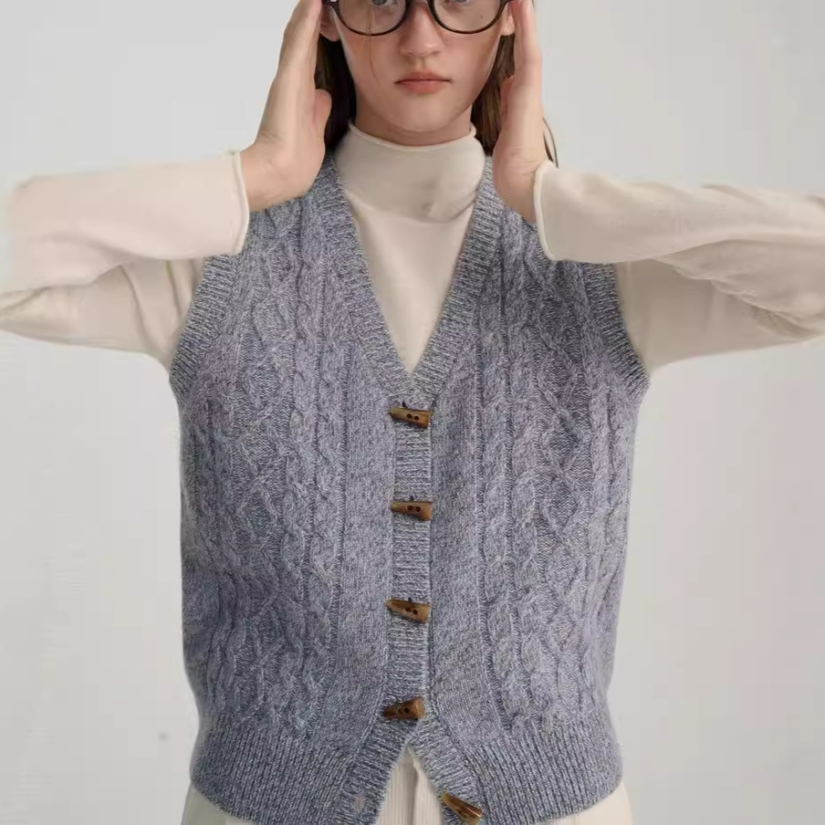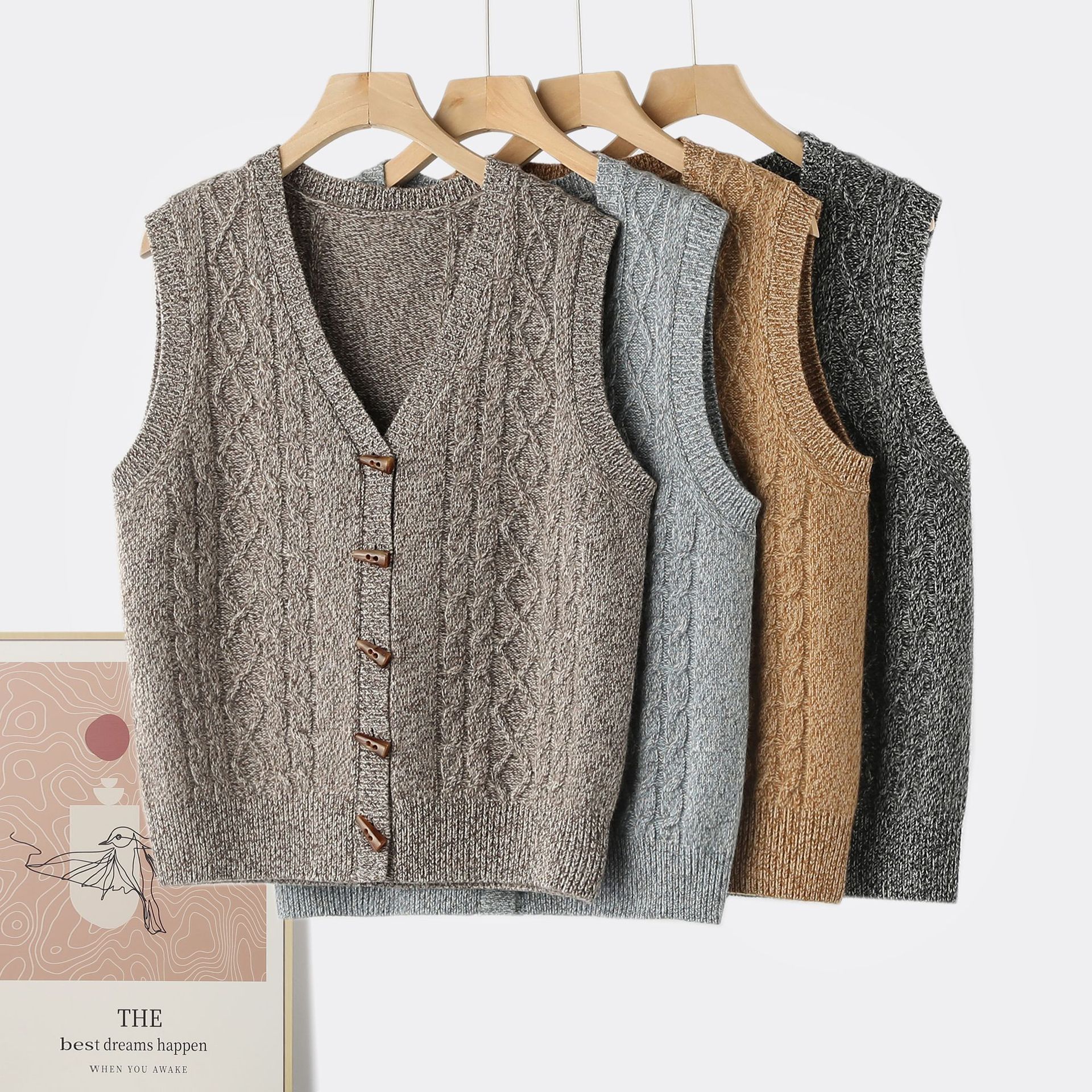 学院风复古夹花100%羊毛针织马甲绞花V领牛角扣无袖背心上衣宽松