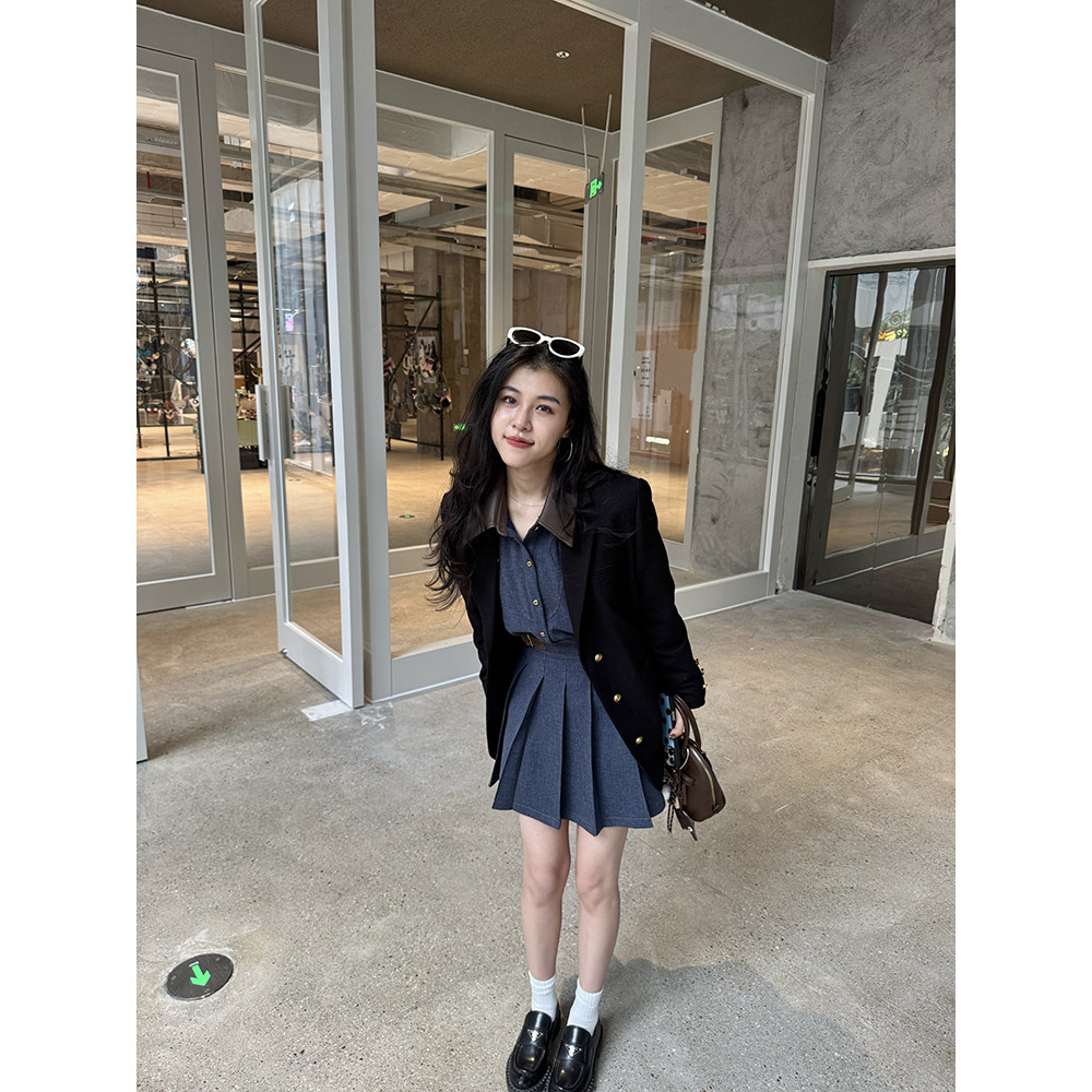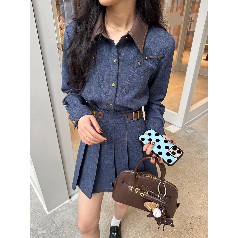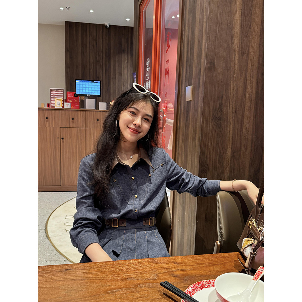 张阿星【耶鲁蓝调】秋季新款复古休闲感翻领撞色百搭修身型连衣裙