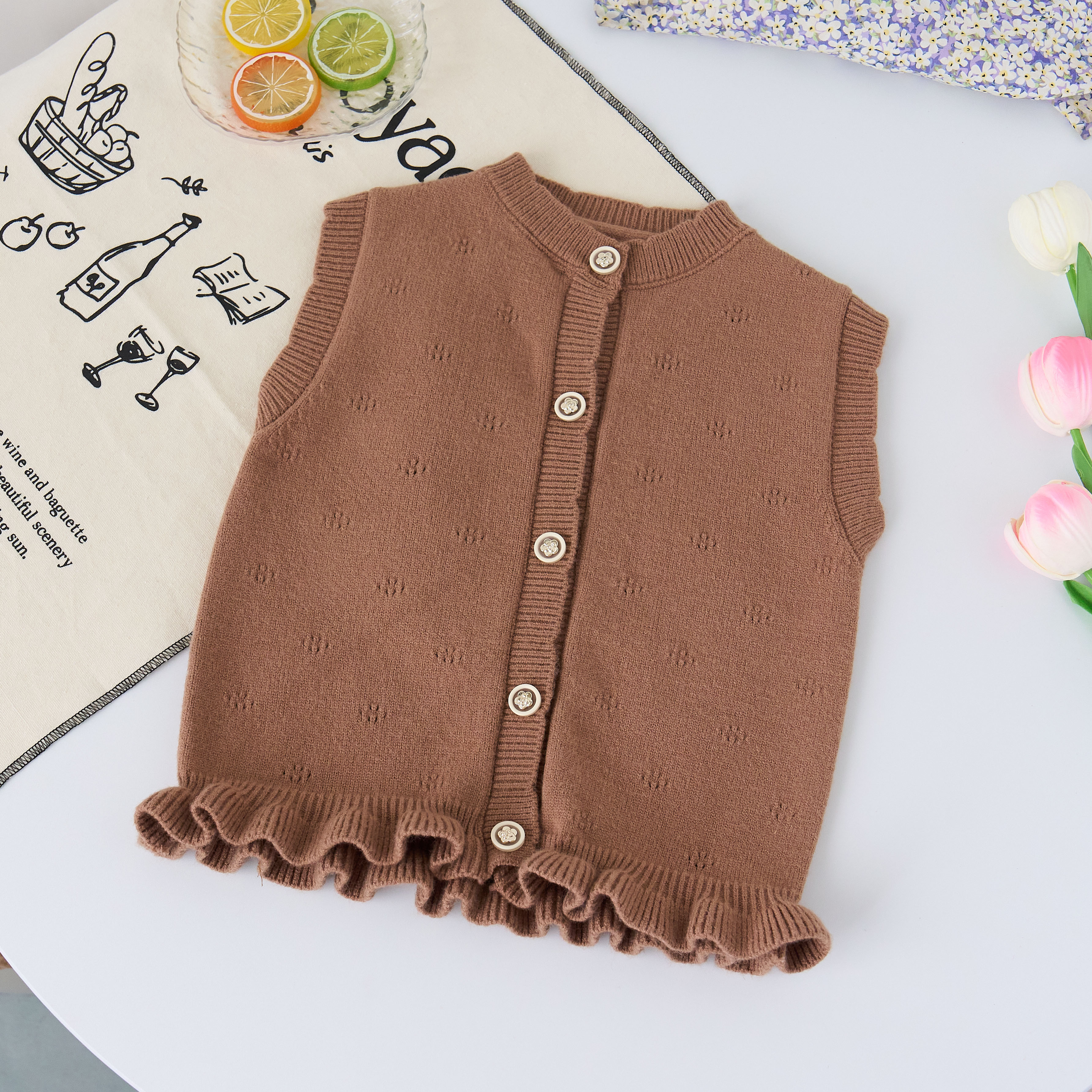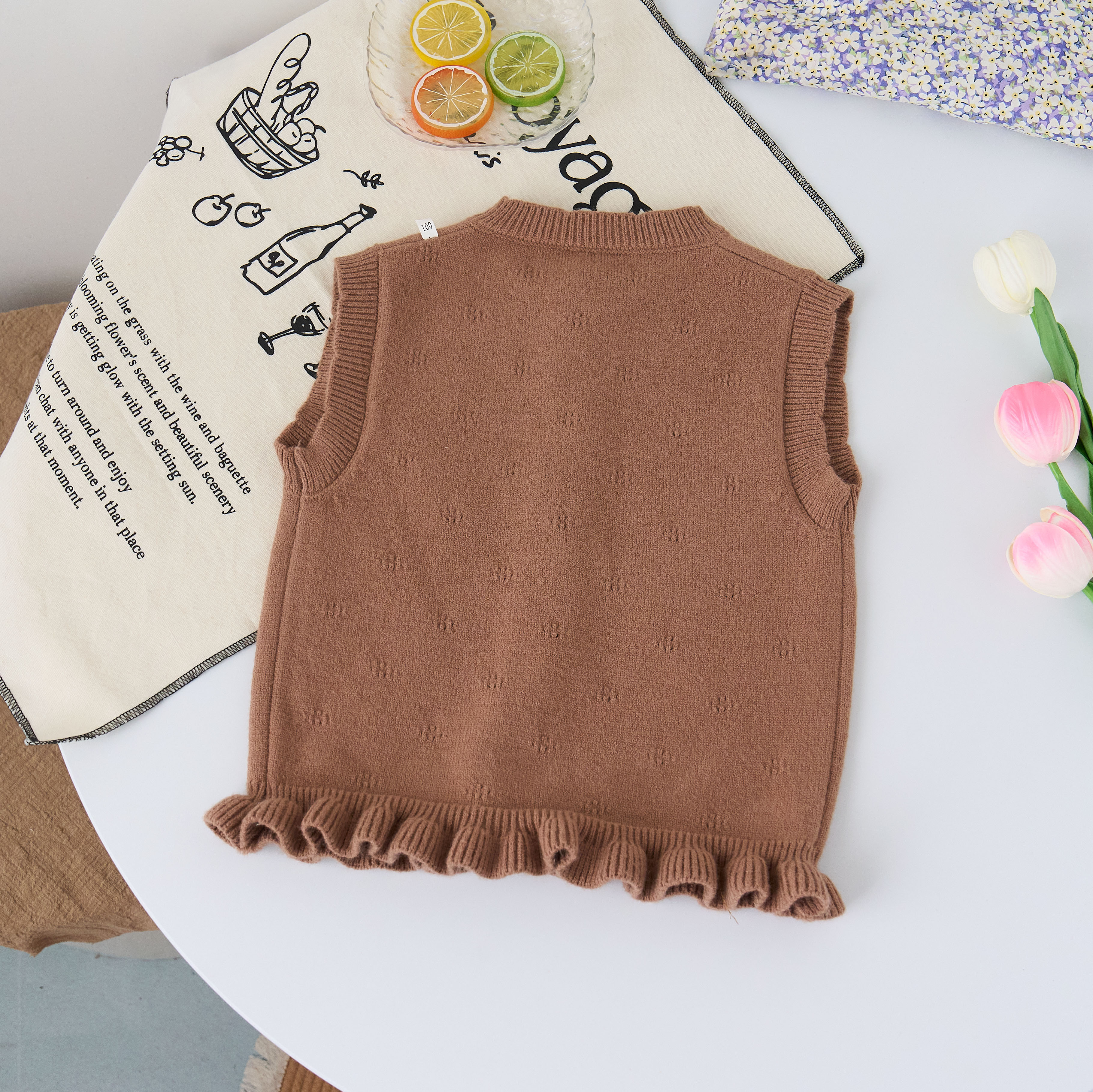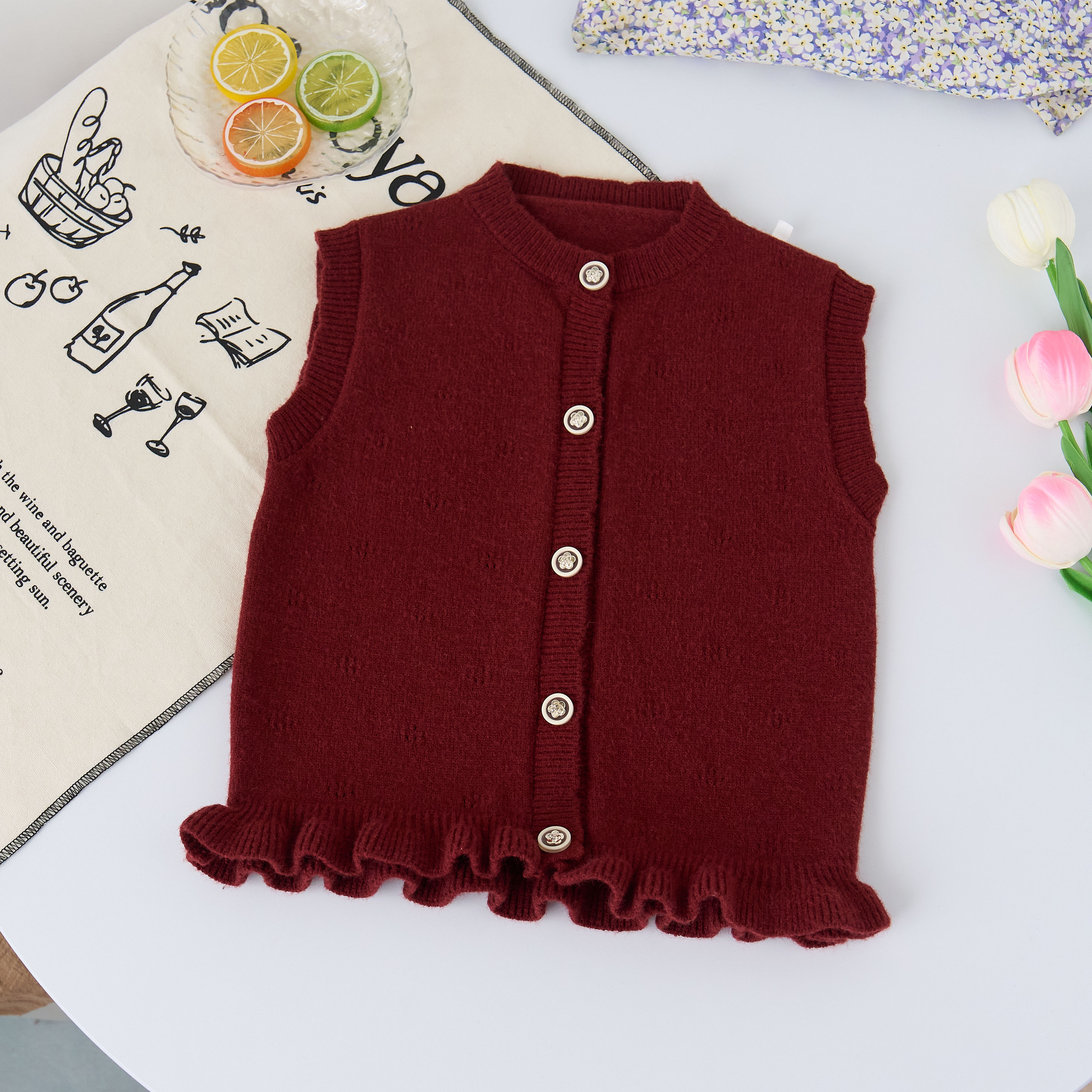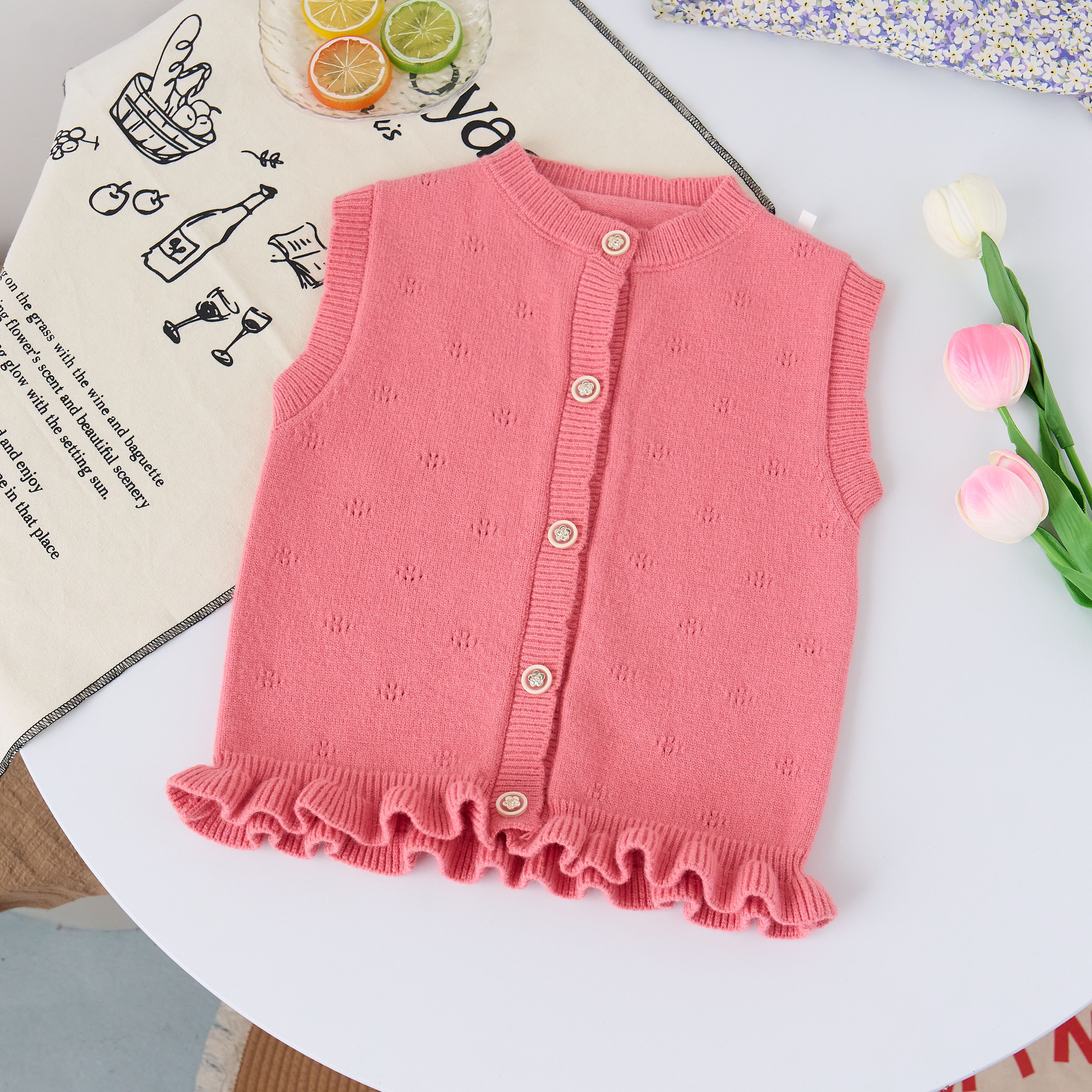 女童2025新款春秋季圆领时尚简约纯色花边中小童针织马甲开衫上衣