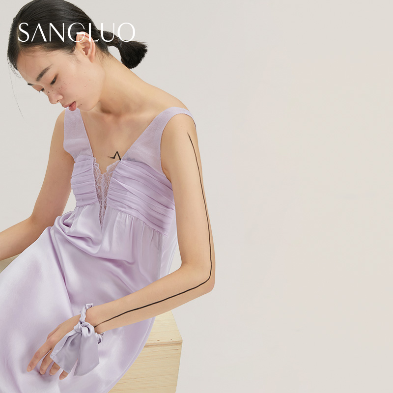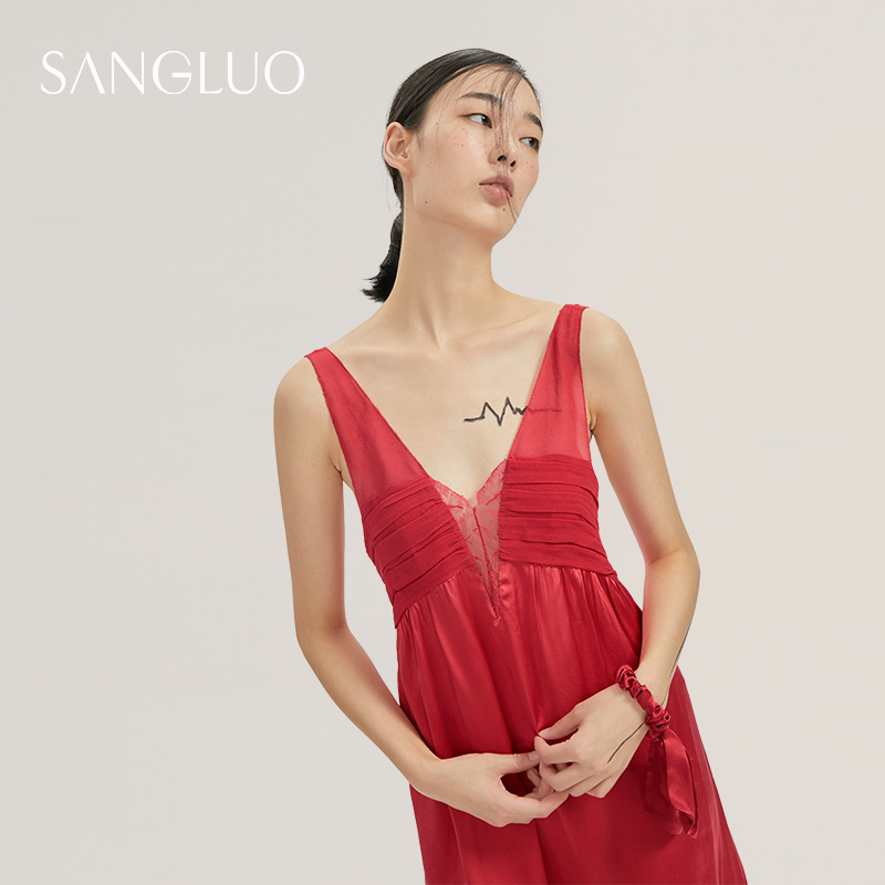 桑罗真丝睡裙吊带轻性感深V胸口红色新年双层防突100%桑蚕丝睡衣