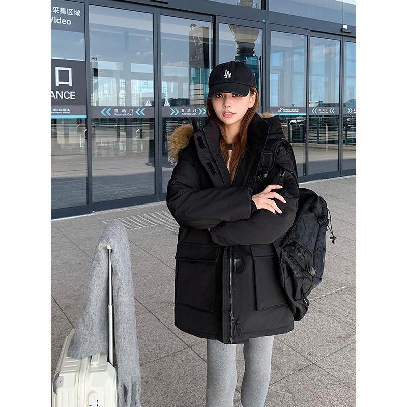 胖mm大码女装韩系休闲工装棉服女冬季加厚保暖冲锋衣黑色连帽棉袄