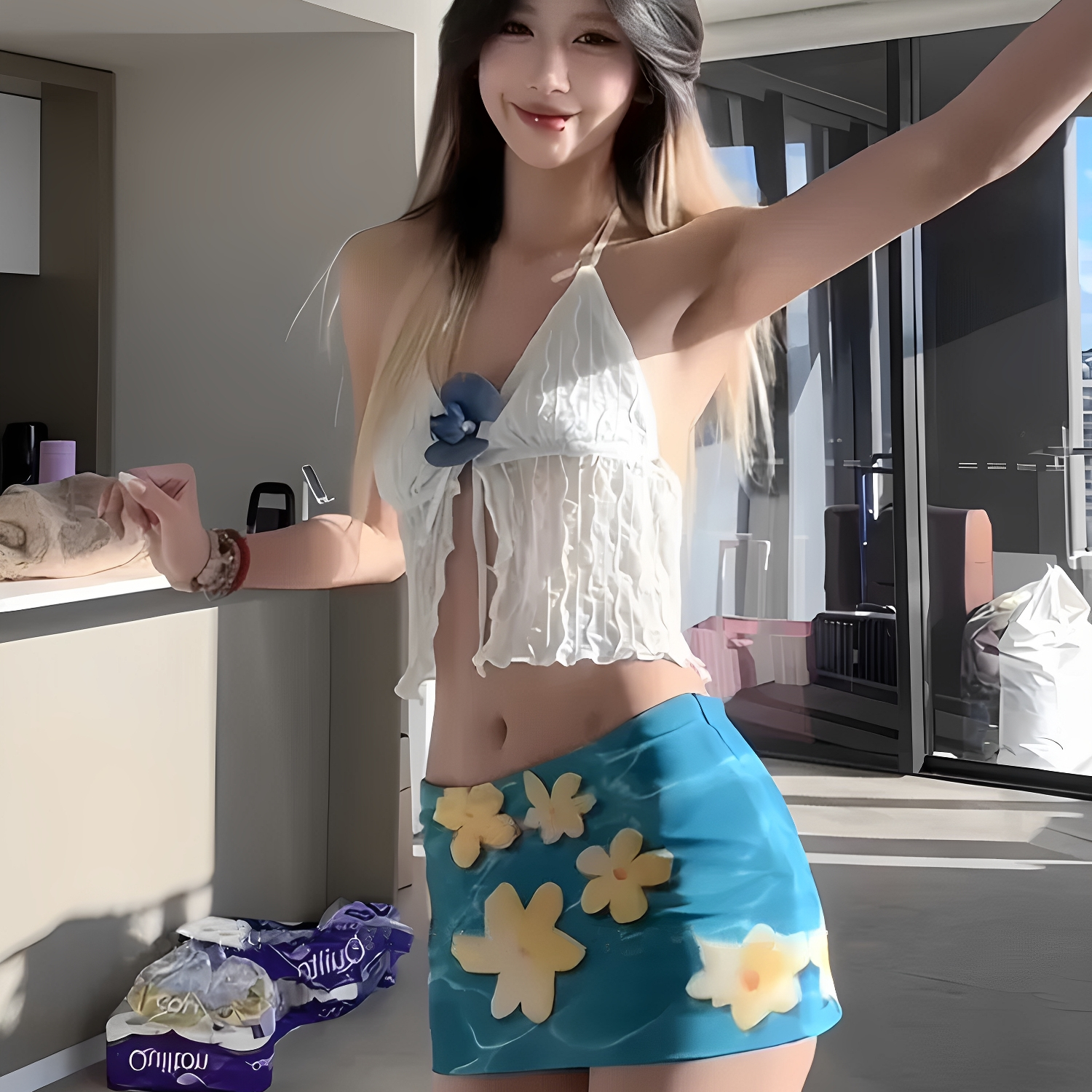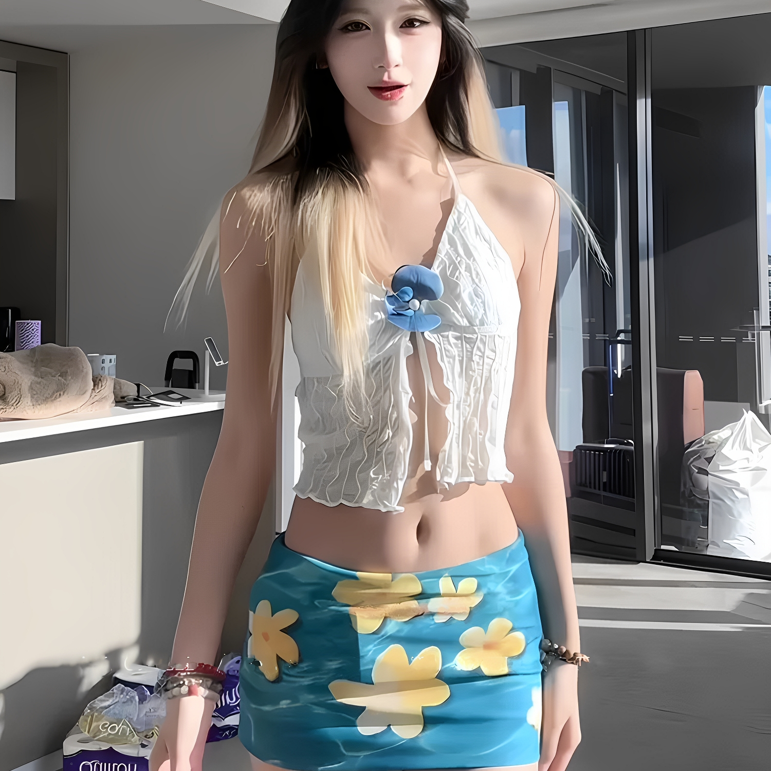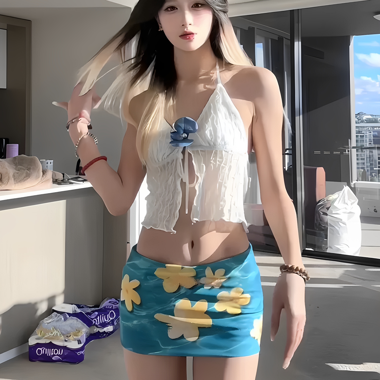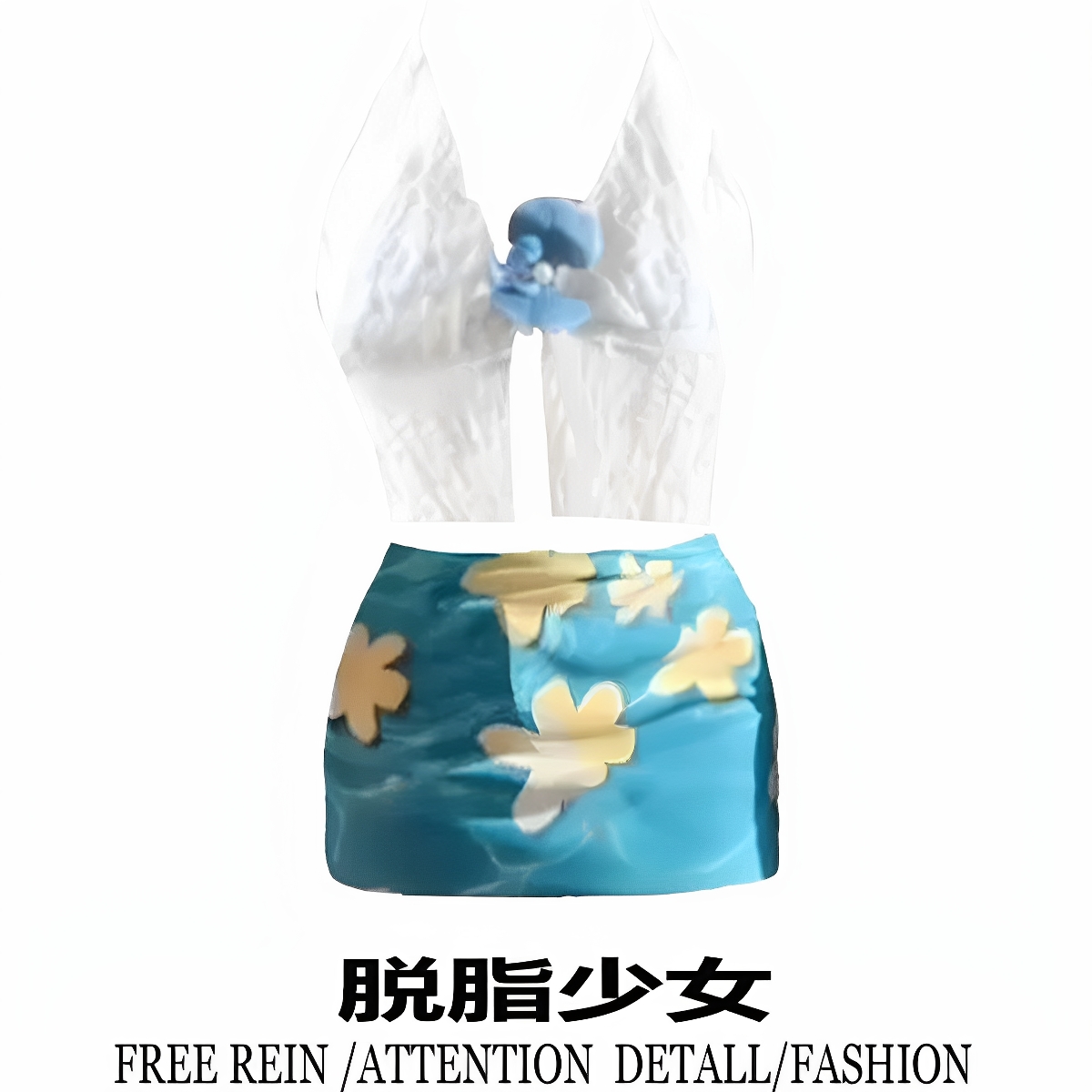 2025新款辣妹风黄色肚脐抽褶挂脖背心女夏季高腰花朵印花包臀泳装