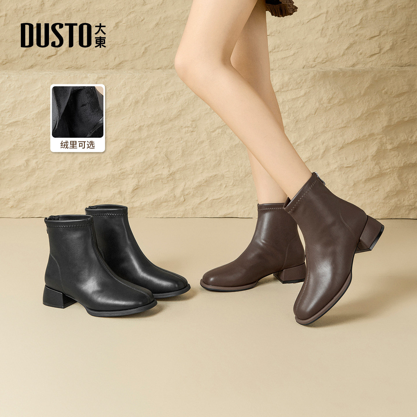 大东女靴时装靴2025冬季新款粗跟方头女短靴经典百搭简约通勤靴子