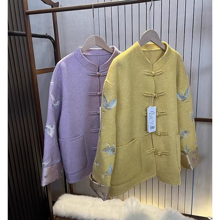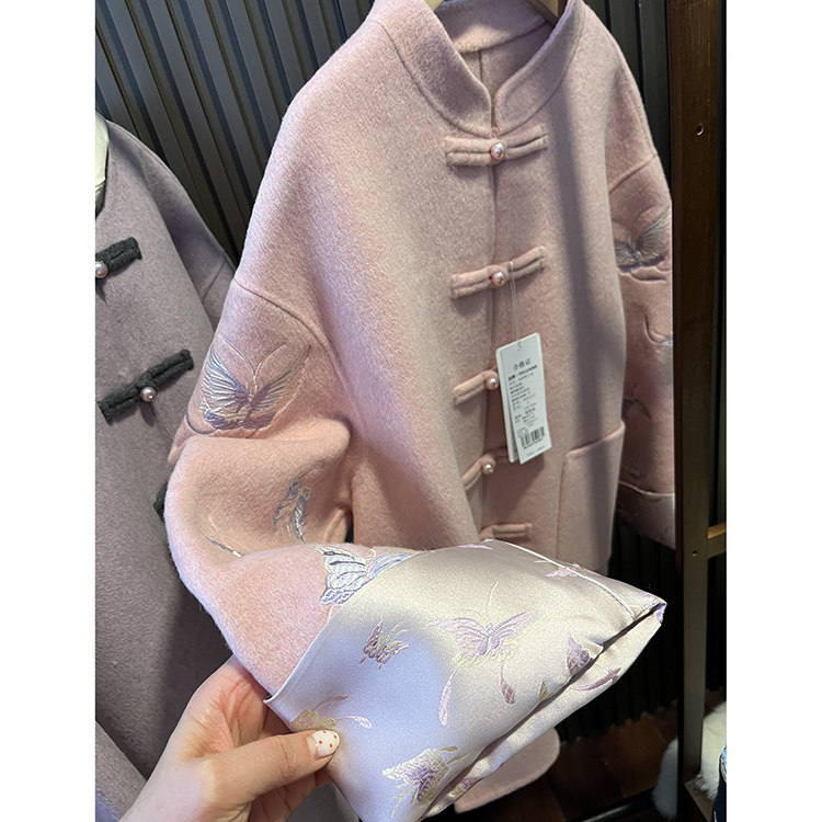羊毛双面呢刺绣外套 高级感新中式国风纯羊呢外套女呢子盘扣大衣
