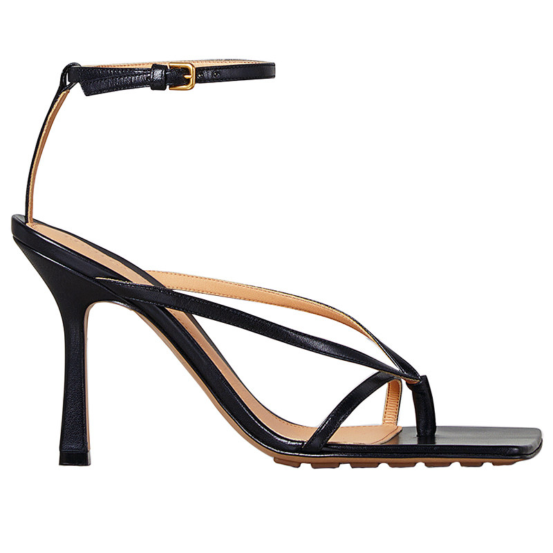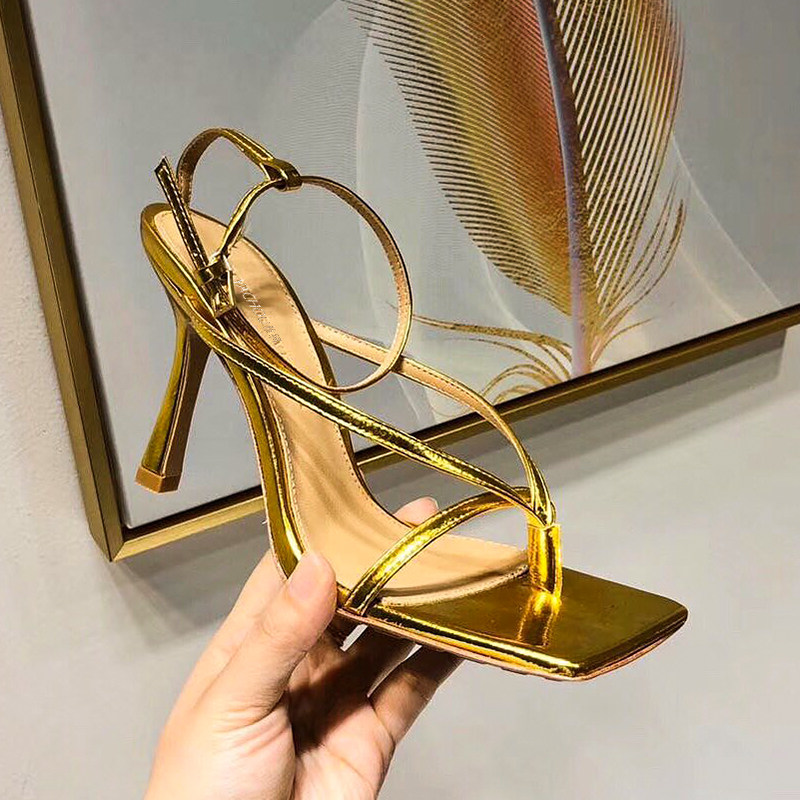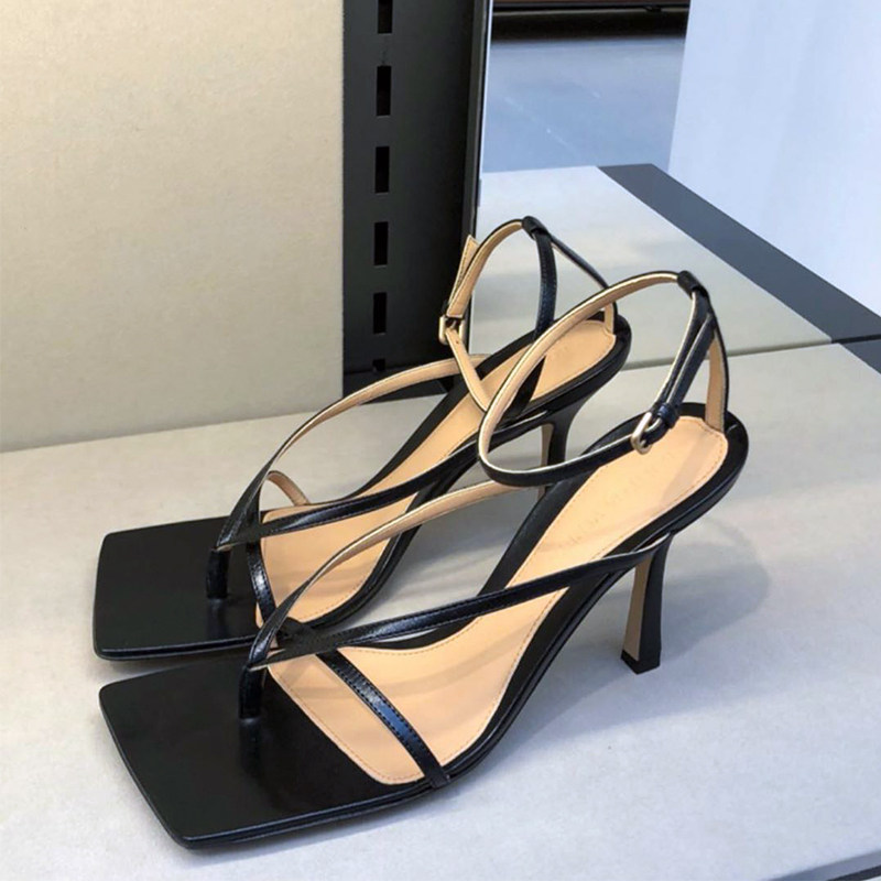 2025新款女真皮 方头绑带高跟凉鞋细跟一字带时尚夹趾脚凉鞋露趾
