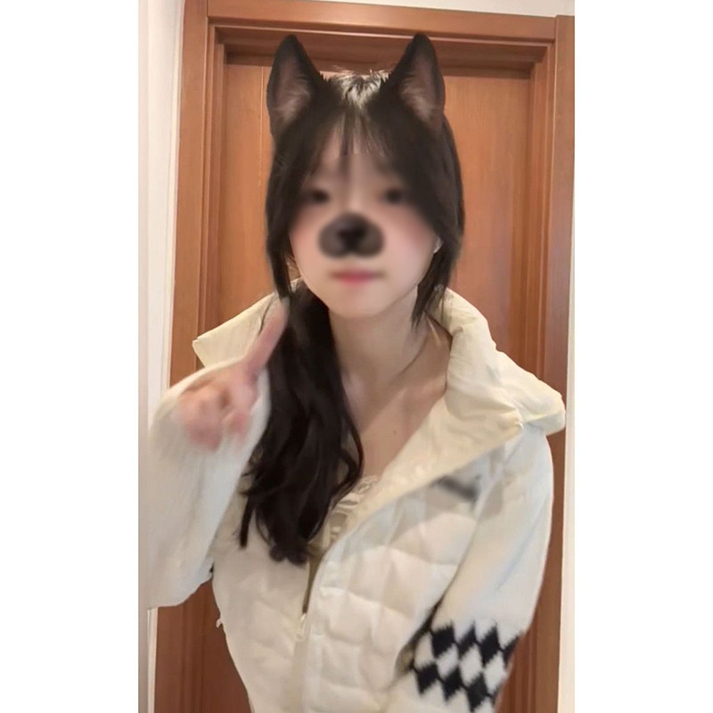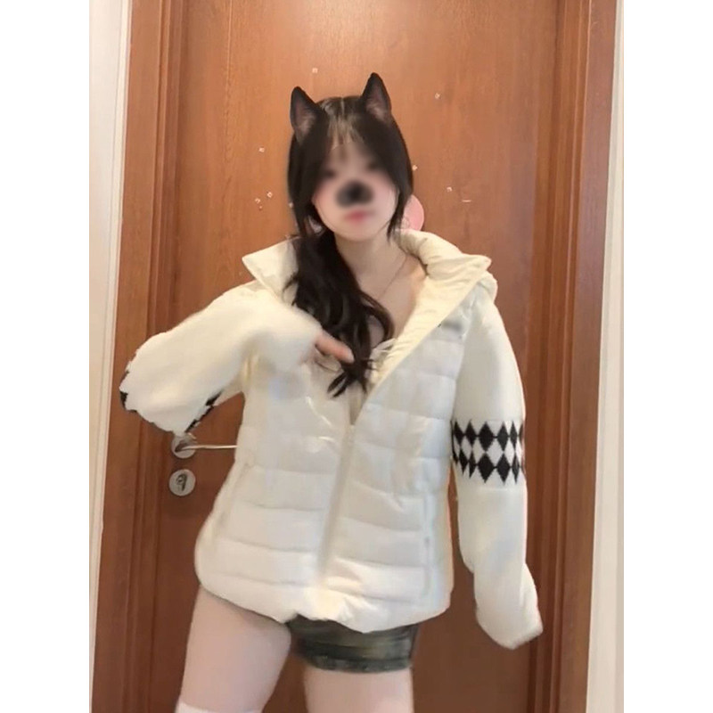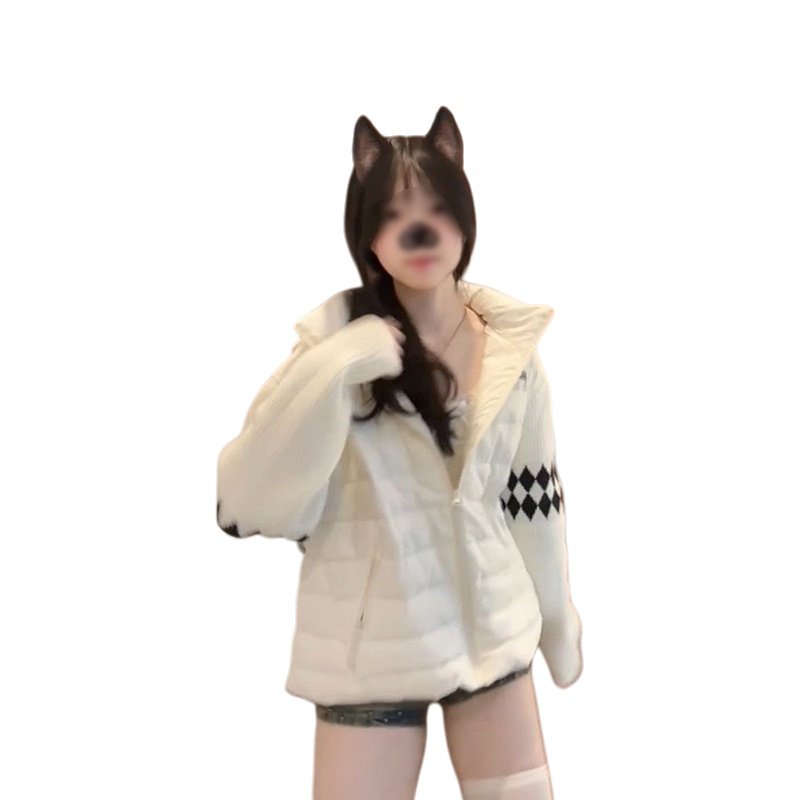 米白色针织拼接立领棉服