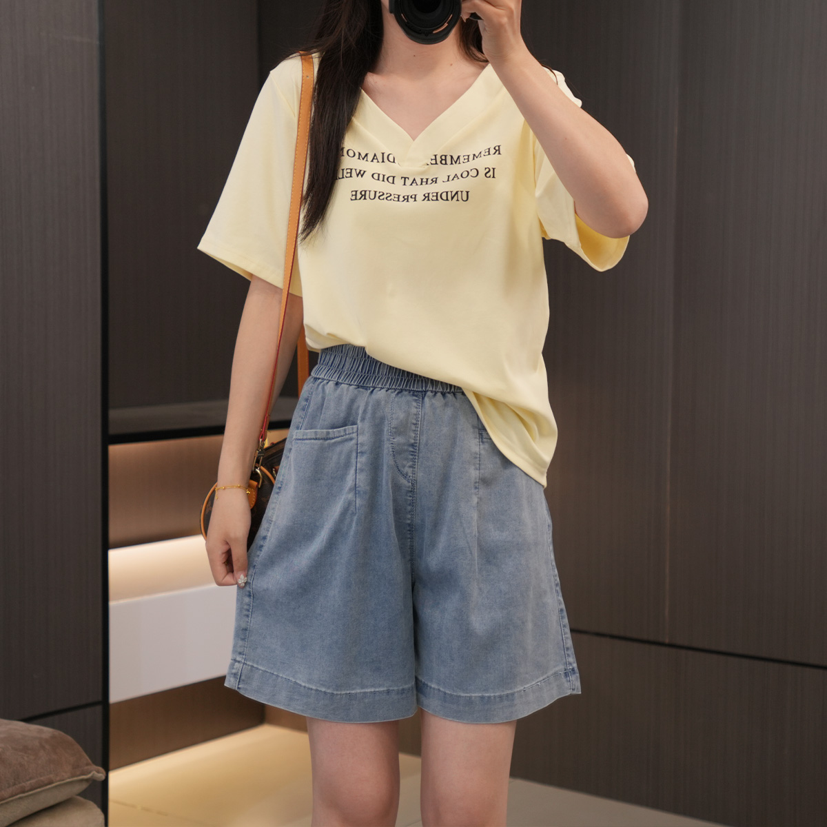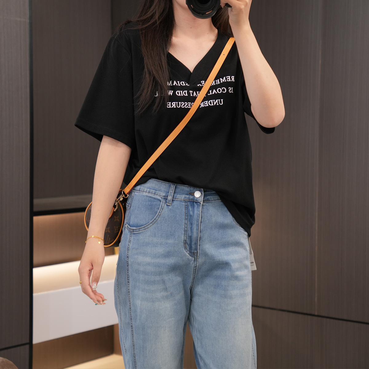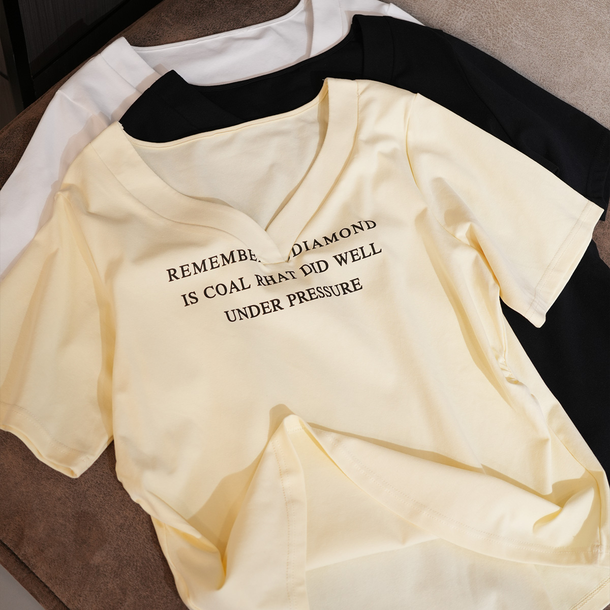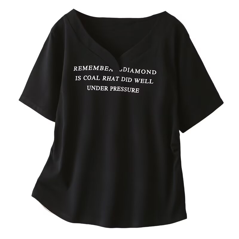 设计感V领收腰显瘦大码短袖夏季胖妹妹高弹力时尚字母印花百搭T恤