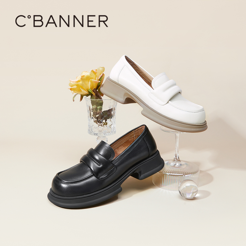 千百度女鞋春秋气质JK乐福鞋厚底时尚潮流小皮鞋真皮一脚蹬增高