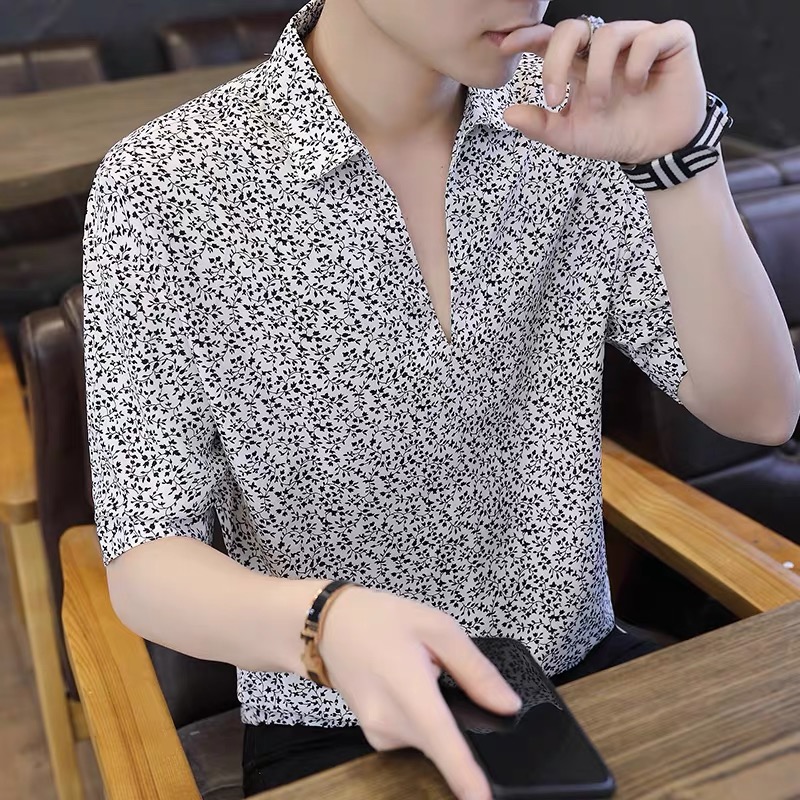 冰丝短袖T恤男V领条纹潮流宽松外贸潮牌痞帅五分袖上衣宽松上衣