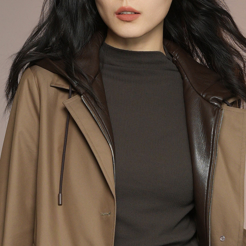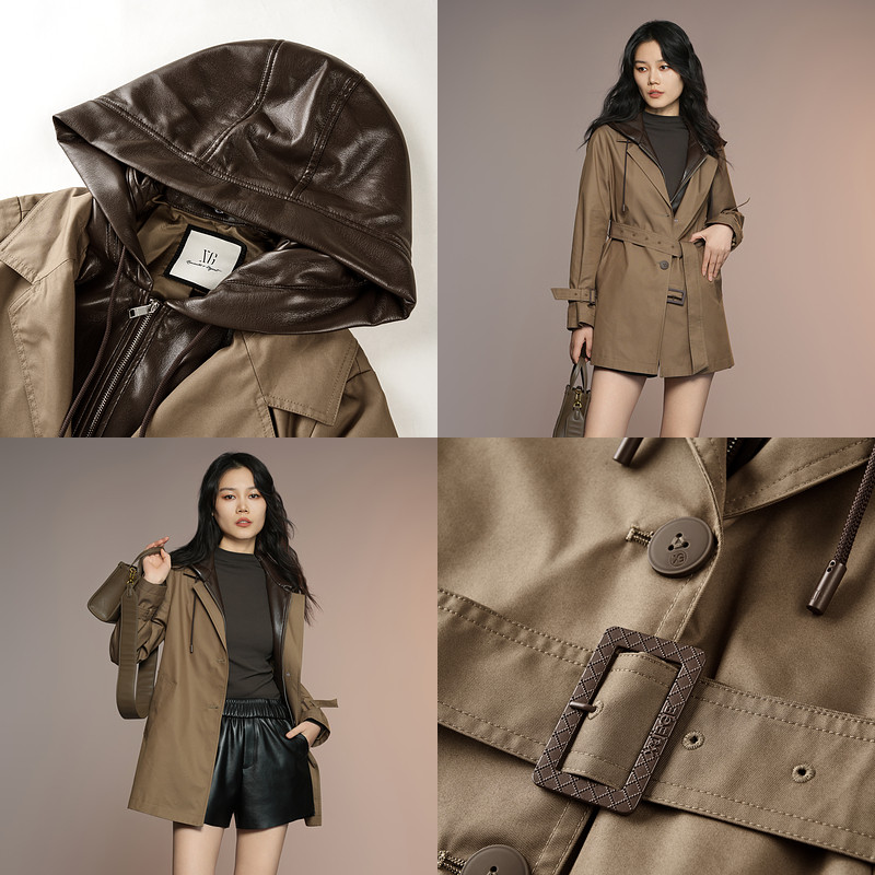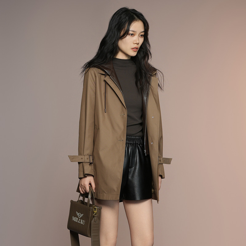 XG雪歌卡其色中长款休闲风衣2025秋季新款通勤简约长袖连帽外套女