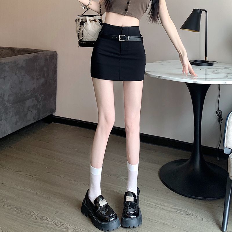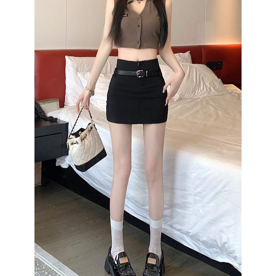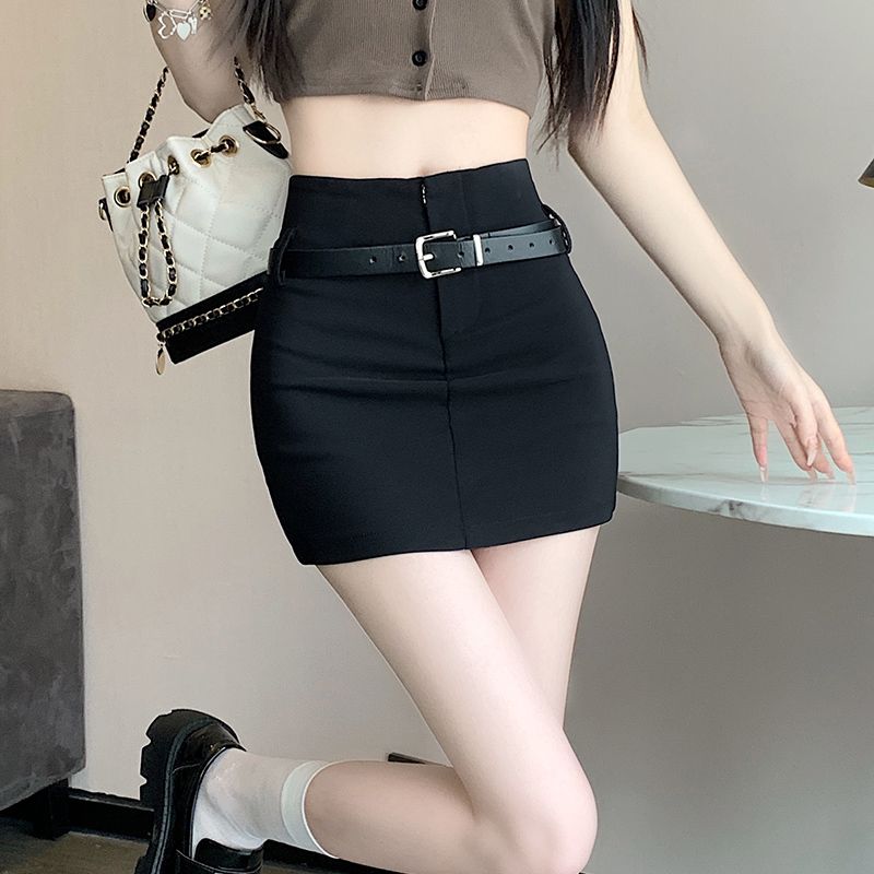 黑色配皮带a字半身裙夏季新款性感辣妹风高腰弹力显瘦包臀短裙子