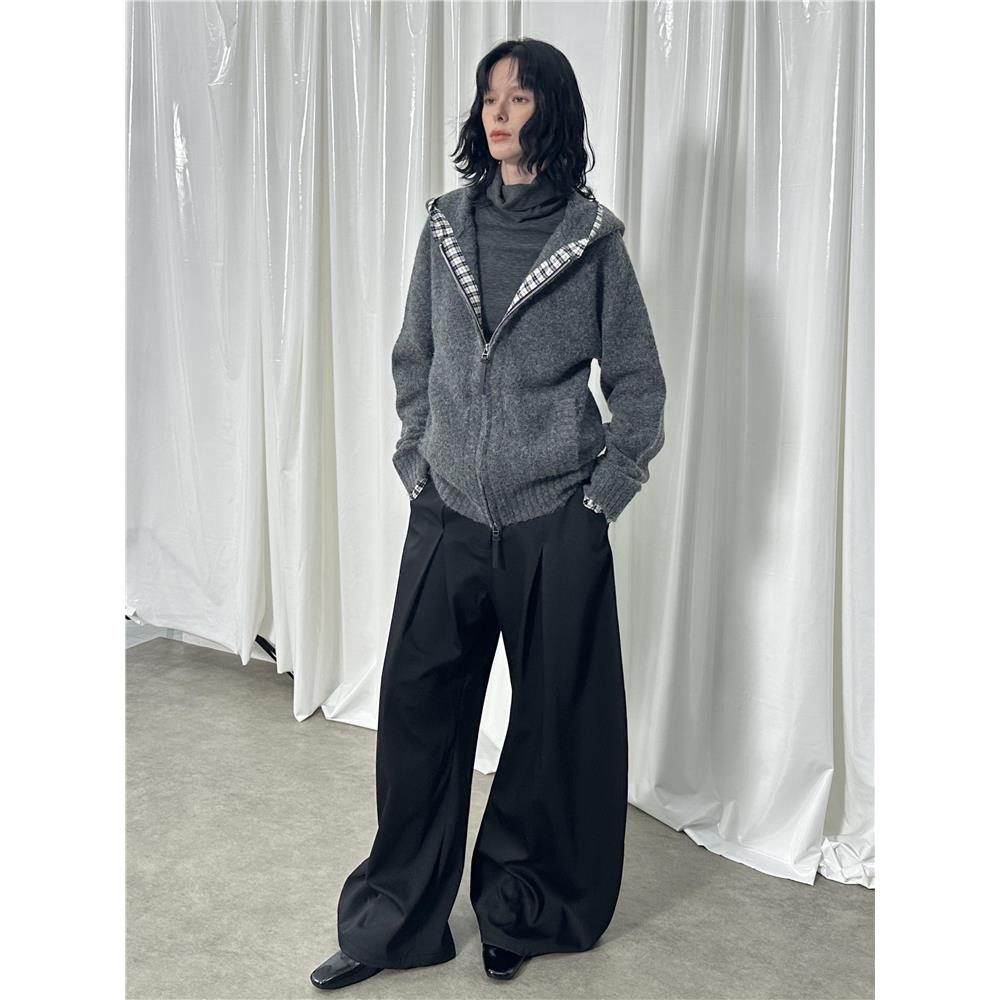 灰色双拉链开衫羊毛拼接格纹连帽毛衣外套男女秋冬季慵懒宽松上衣