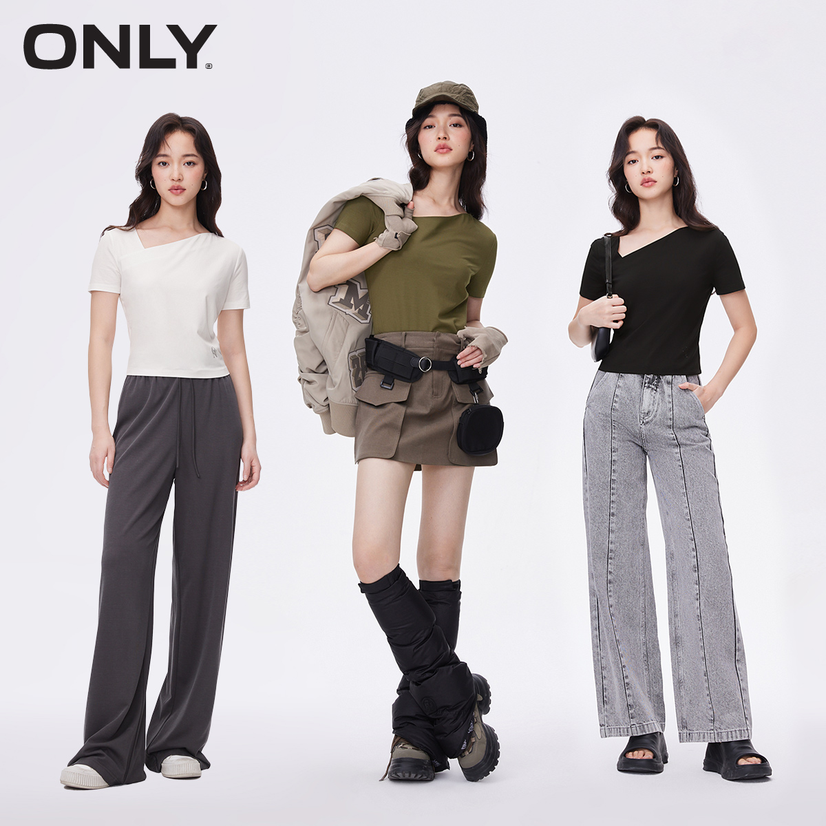 【新】ONLY2025冬新款简约百搭舒适不对称领口短款T恤女